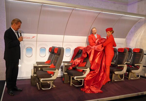 Lufthansa Group subsidiary Austrian Airlines unveiled a new premium-economy seat in Vienna Sept. 5, which will be installed on 12 long-haul aircraft. The new product, made by German manufacturer ZIM, offers a 34-in. seat pitch and a 40-degree adjustable backrest. Pictured: Austrian Airlines CCO Andreas Otto reveals ZIM premium-economy seats