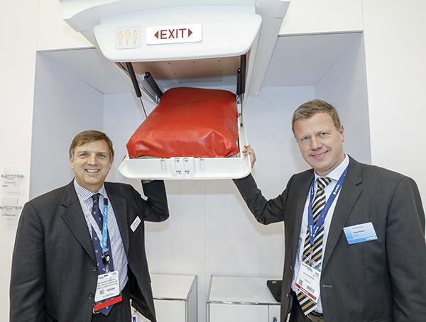 A mock-up of the Centerline Ceiling Stowage compartment line-fit option for new Airbus A320 family aircraft is shown at Aircraft Interiors Expo 2017 by HAECO Americas CEO Richard Kendall and Klaus Roewe, SVP-head of A320 Program at Airbus.