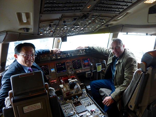 EVA Air country manager-Austria Edward Ho and ATW correspondent Kurt Hofmann in the cockpit.