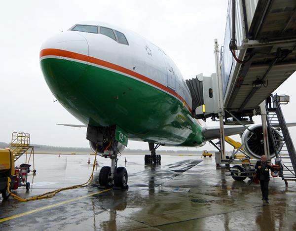 Water salute welcome for the first EVA Air Boeing 777-300ER in Vienna Oct. 4.