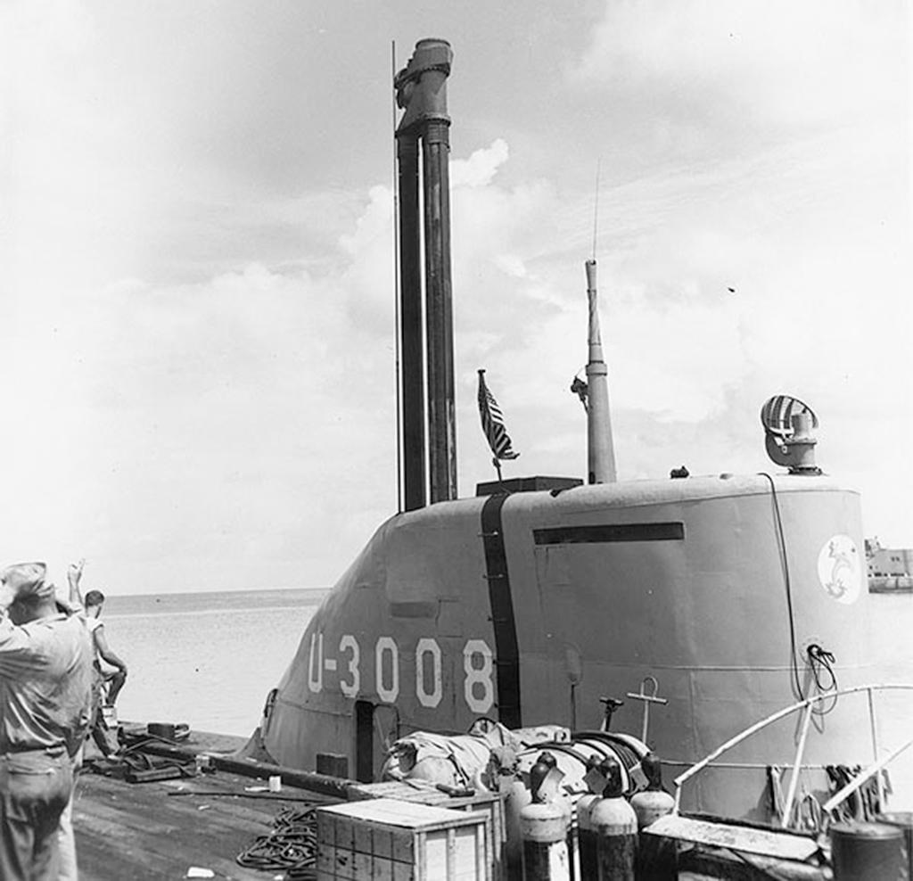 The Type XXI Elektroboot submarine combined much enlarged battery capacity, a streamlined hull and a snorkel, permitting it to recharge its batteries while submerged. ASW experts call the end of the war in Europe “saved by the bell”: If the Type XXI had entered service in large numbers, it would have been extremely hard to defeat. This Type XXI was captured intact and evaluated by the U.S. Navy.