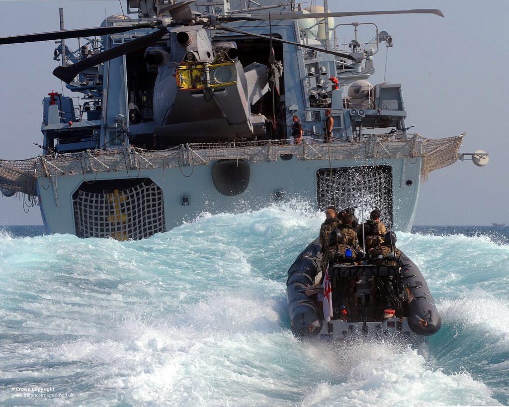 The Royal Navy’s Type 23 frigates, commissioned in 1990-2002, are primarily ASW ships. The big three-engine AgustaWestland Merlin helicopter is a powerful ASW system in its own right, with an active dipping sonar and a range of expendable sonobuoys. The ships carry a large towed-array sonar, visible in the port-side opening in the stern, which is being upgraded to the new Thales Sonar 2087 model. It is classified as “medium-frequency,” with active bands between 900 and 2100 Hz.