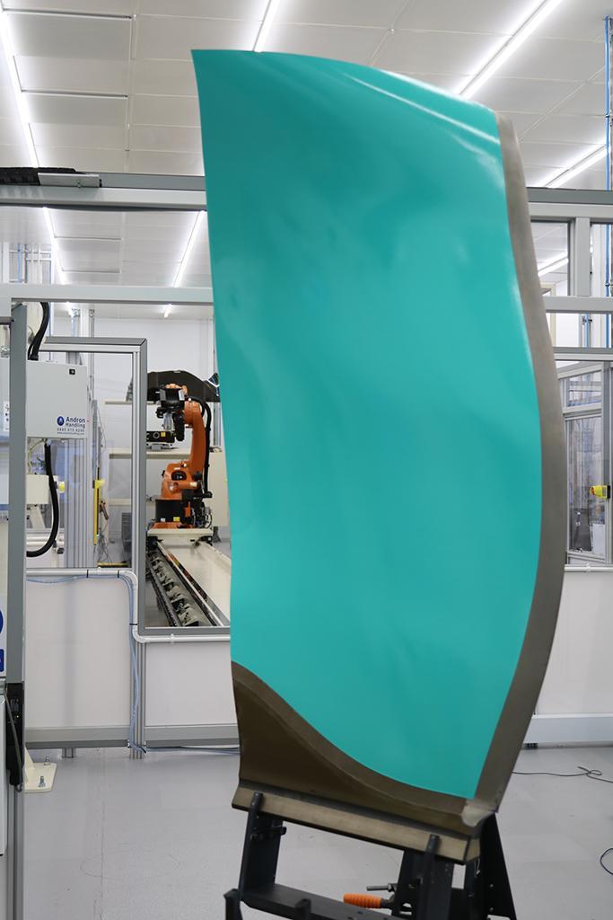 4基のUltraFan実証機それぞれには18枚のブレードが使用され、これに用いられる複数の複合チタン製ブレードが製造中だ。各ブレードはHexcel社のHexPly M91炭素繊維強化エポキシリプレグを500枚積層したもので、オートクレーブで硬化される前に自動積層される。精密加工とコーティングが施された後、前縁部にチタン製の保護シースが接着され、腐食やFOD、バードストライクなどからブレードを保護する。
