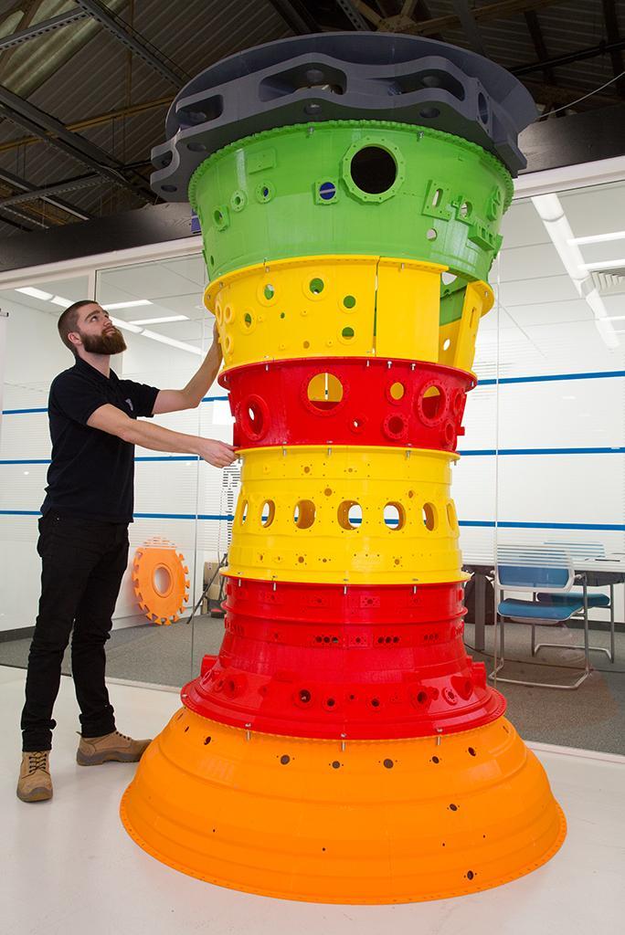 イギリスのダービーにあるロールスロイス社の「DemoWorks」拠点にUF001の部品が到着し始めたことで、同社はデジタル作業手順書を用いた新たな組み立て方法の評価を行なっている。エンジニアやメカニックたちは、主な金型やプラスチック製のレプリカ部品を用いて組み立ての練習をしている(写真は主要なコアモジュール)。写真にある、カラフルな巨大アイスキャンディーのようなコアには、上部にパワーギアボックスのマウント、下部に高速中間タービンシステムモジュールが配置されている。