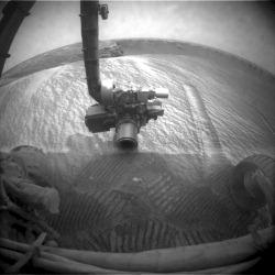The Mars Rover Opportunity deploys its science arm to sample material at the extreme edge of Victoria crater before driving in last week. Opportunity drove 13 ft. into the crater to get all six wheels past the rim before backing uphill for about 10 ft. The driving commands included a precaution for...