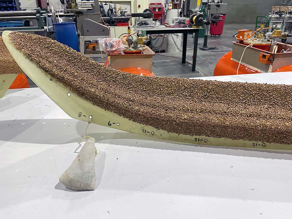The crust on these composite winglets is artificial ice designed and built by AeroTEC for ice accretion flight testing. During testing, AeroTEC must determine an aircraft’s full capabilities during an icing encounter, so these types of models help it perform analysis to determine how ice forms, freezes and grows.