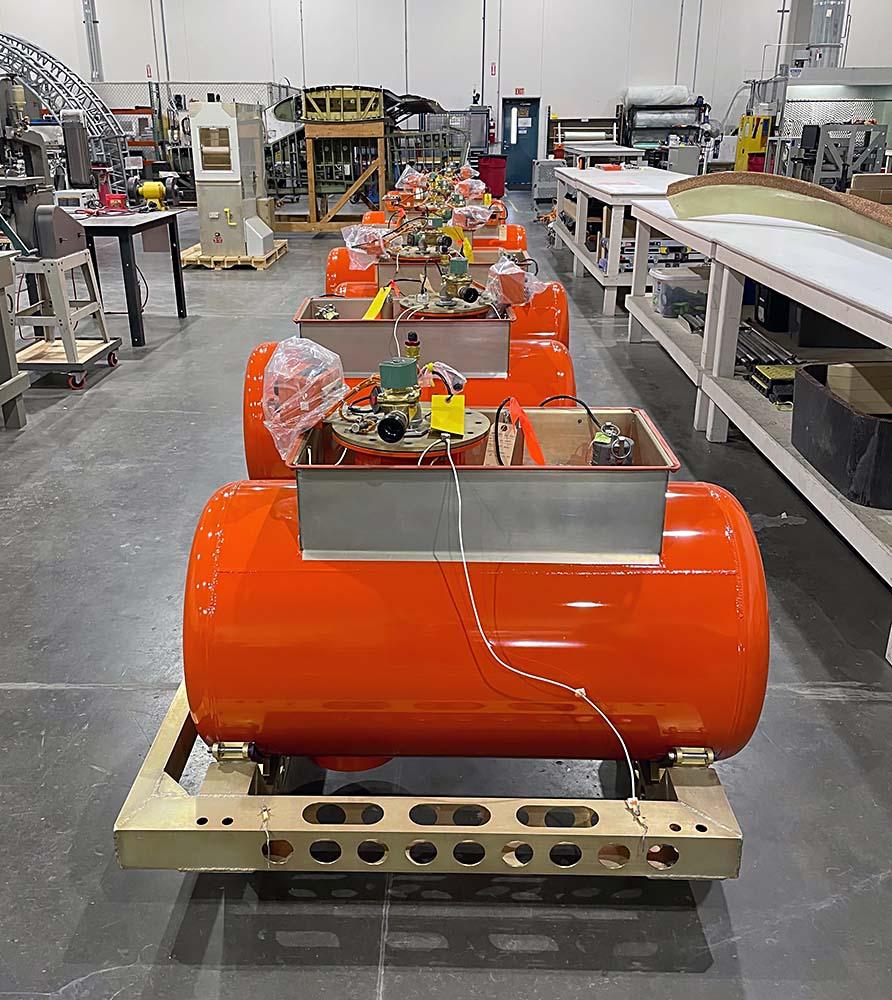 AeroTEC manufactured and was preparing to ship these orange water ballast systems for a customer. The systems are used as a way to load aircraft without having passengers on-board so the center of gravity can be moved from the control system during flight.