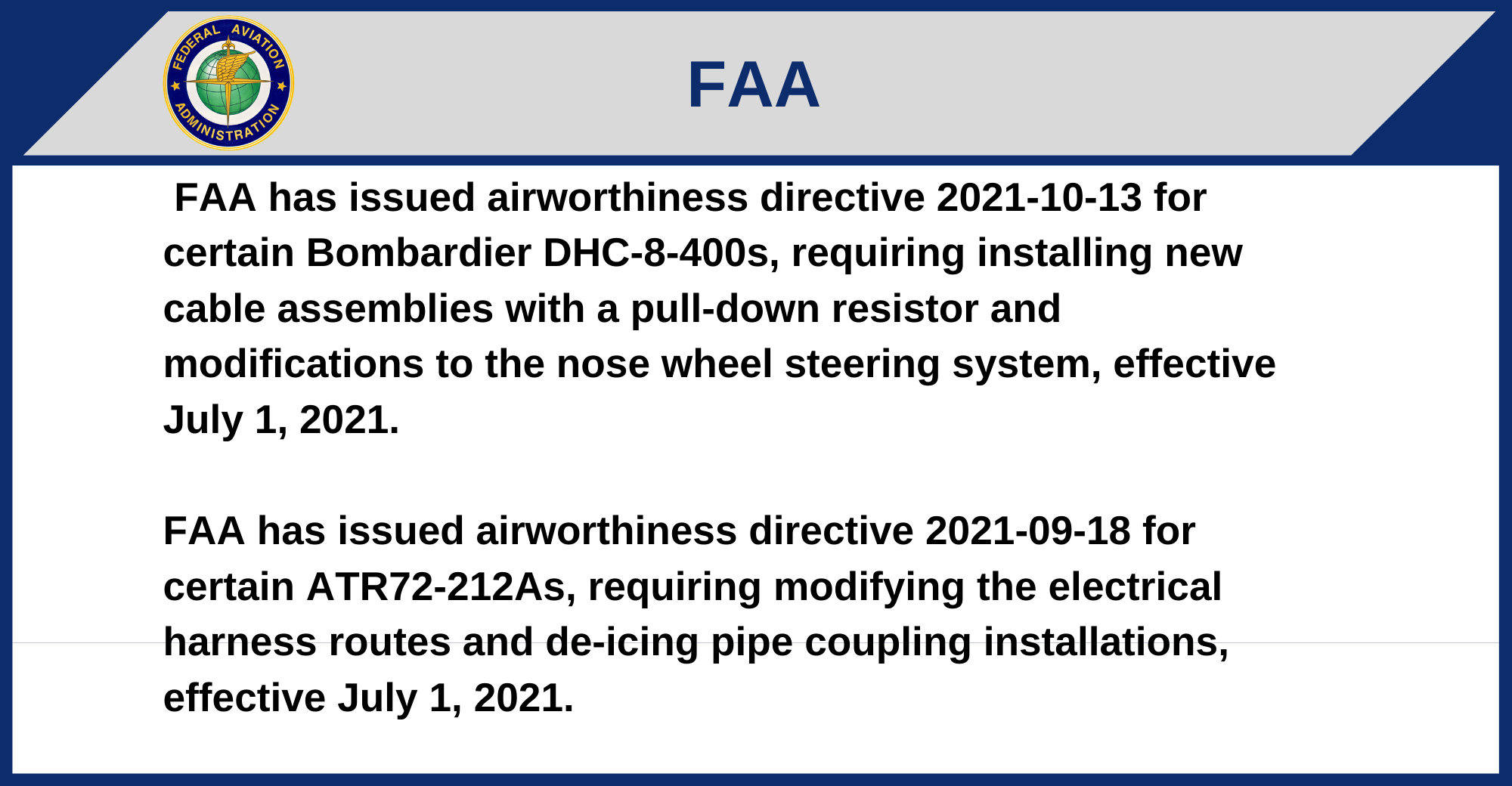 FAA has issued airworthiness directive 2021-10-13 for certain Bombardier DHC-8-400s, requiring installing new cable assemblies with a pull-down resistor and modifications to the nose wheel steering system, effective July 1, 2021. FAA has issued airworthiness directive 2021-09-18 for certain ATR72-212As, requiring modifying the electrical harness routes and de-icing pipe coupling installations, effective July 1, 2021.