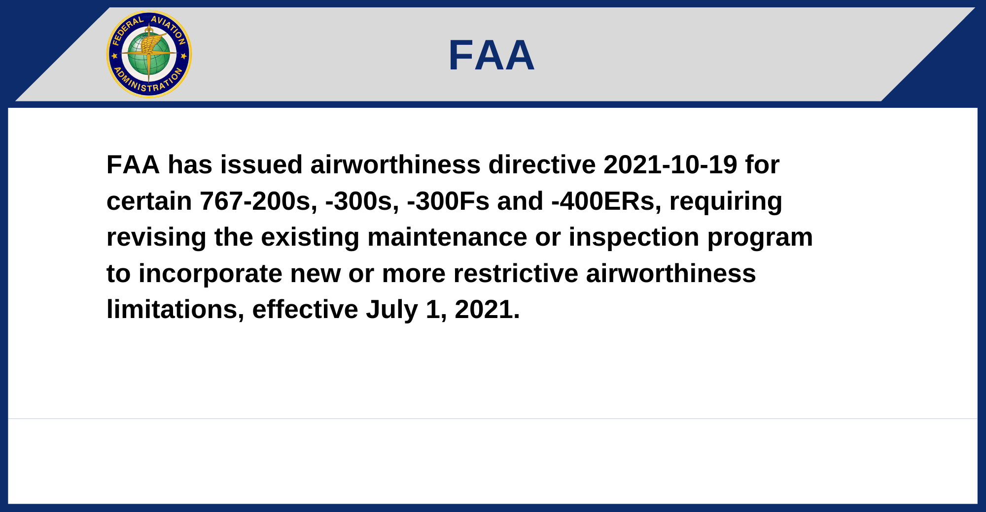 FAA has issued airworthiness directive 2021-10-19 for certain 767-200s, -300s, -300Fs and -400ERs, requiring revising the existing maintenance or inspection program to incorporate new or more restrictive airworthiness limitations, effective July 1, 2021.