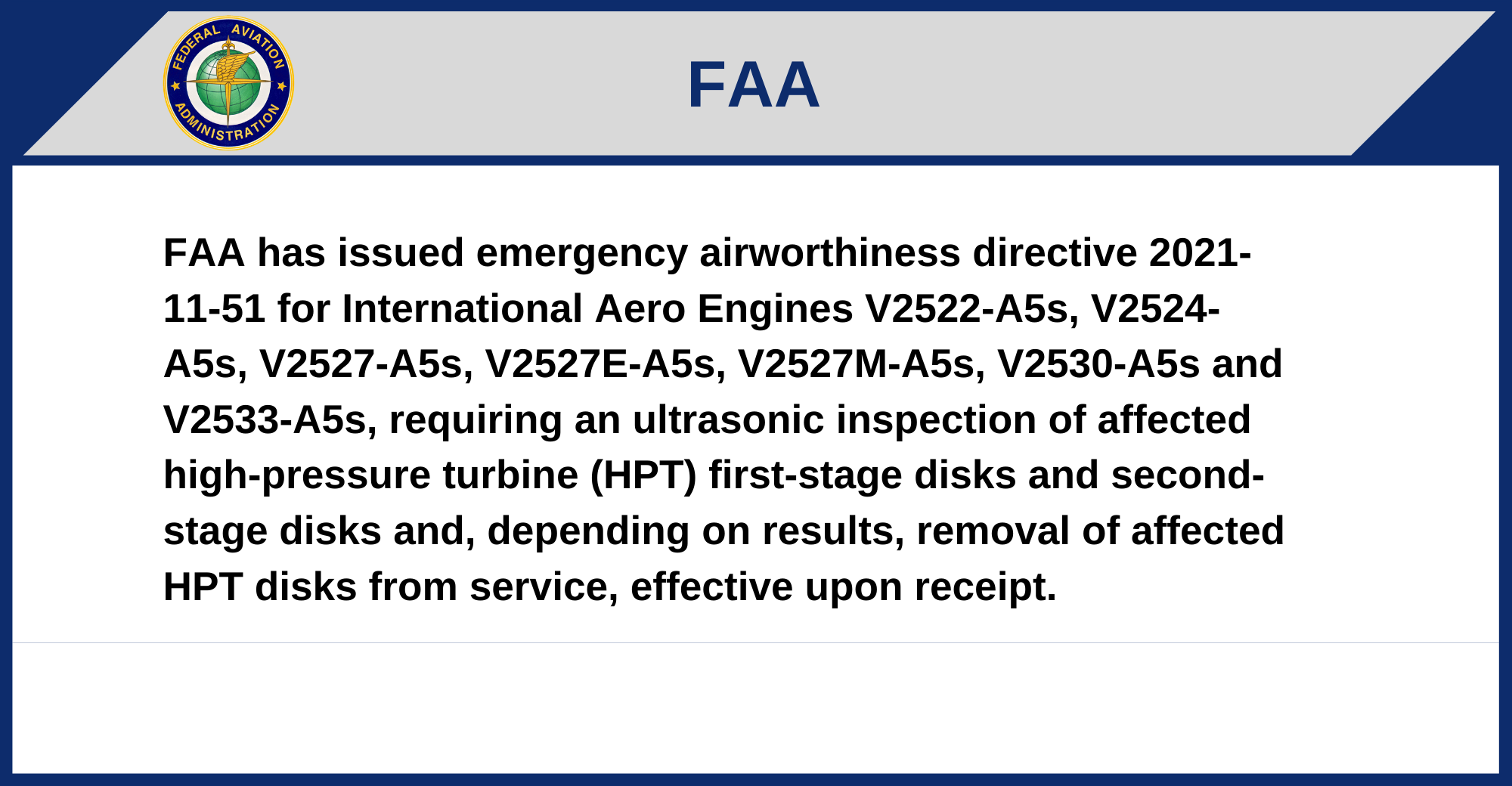 FAA has issued emergency airworthiness directive 2021-11-51 for International Aero Engines V2522-A5s, V2524-A5s, V2527-A5s, V2527E-A5s, V2527M-A5s, V2530-A5s and V2533-A5s, requiring an ultrasonic inspection of affected high-pressure turbine (HPT) first-stage disks and second-stage disks and, depending on results, removal of affected HPT disks from service, effective upon receipt.