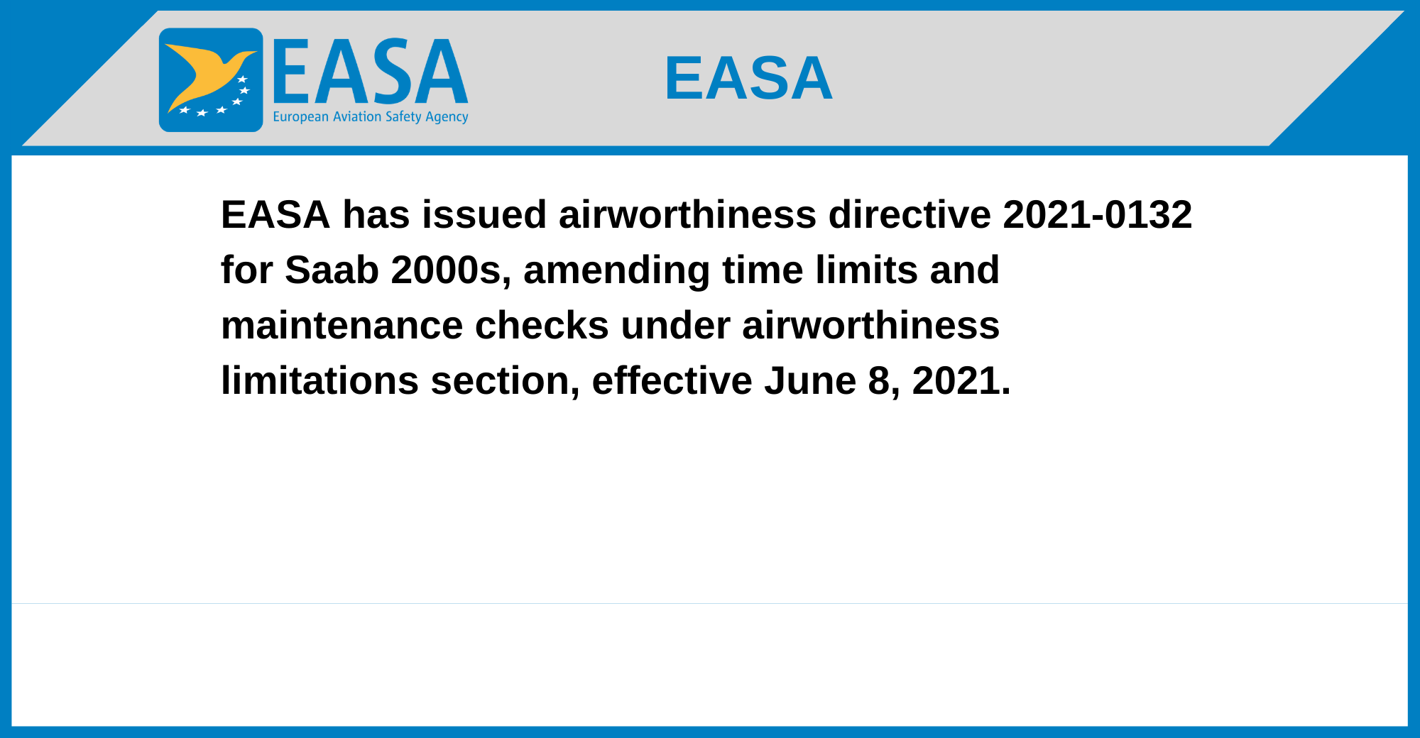 EASA has issued airworthiness directive 2021-0132 for Saab 2000s, amending time limits and maintenance checks under airworthiness limitations section, effective June 8, 2021.
