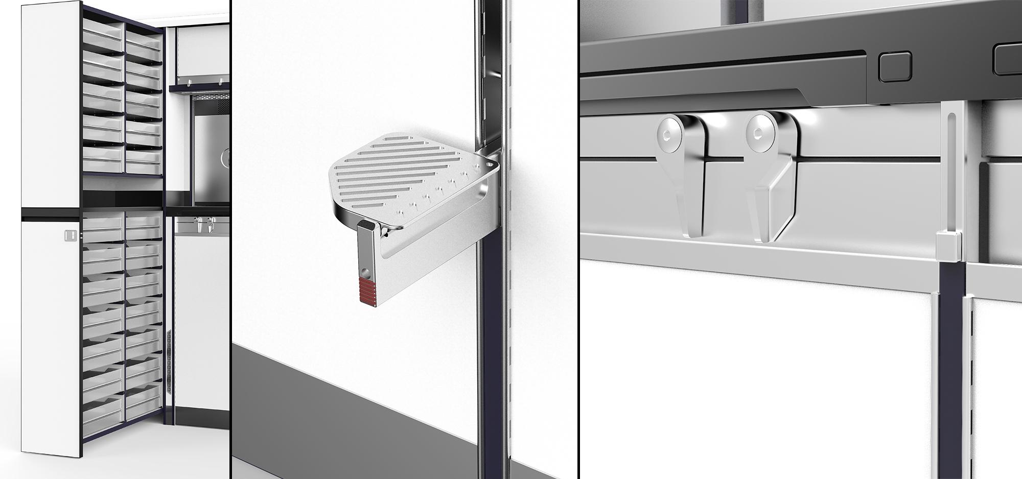 AIM Altitude has also introduced a number of galley features designed for easier operation and maintenance. These include clip-on trim, replaceable décor panels, a folding ergonomic footstep, a customizable pull-out pantry, and a pull-out table that sits flush with the galley worktop to simplify meal preparation, cleaning and sanitization.