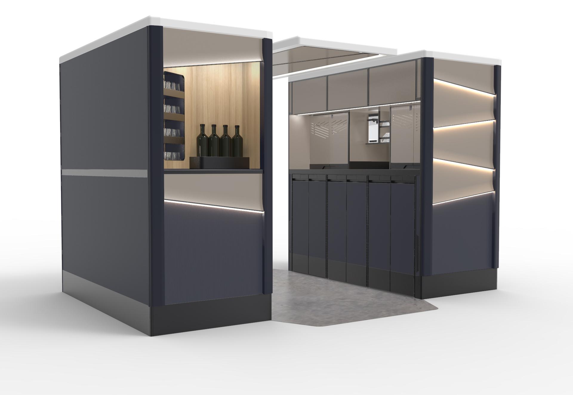 Like AIM Altitude, Collins Aerospace recently launched a product aimed at galley flexibility. Its M-Flex Duet product, a 2019 Crystal Cabin Awards finalist, transforms the aircraft doorway into either a self-serve social zone or cabin attendant working area. During flights, the compact monuments can be unfolded to provided extended galley space. Since the product has been designed to fit within standard monument footprints, Collins says it can be easily installed as a line-fit or retrofit solution.