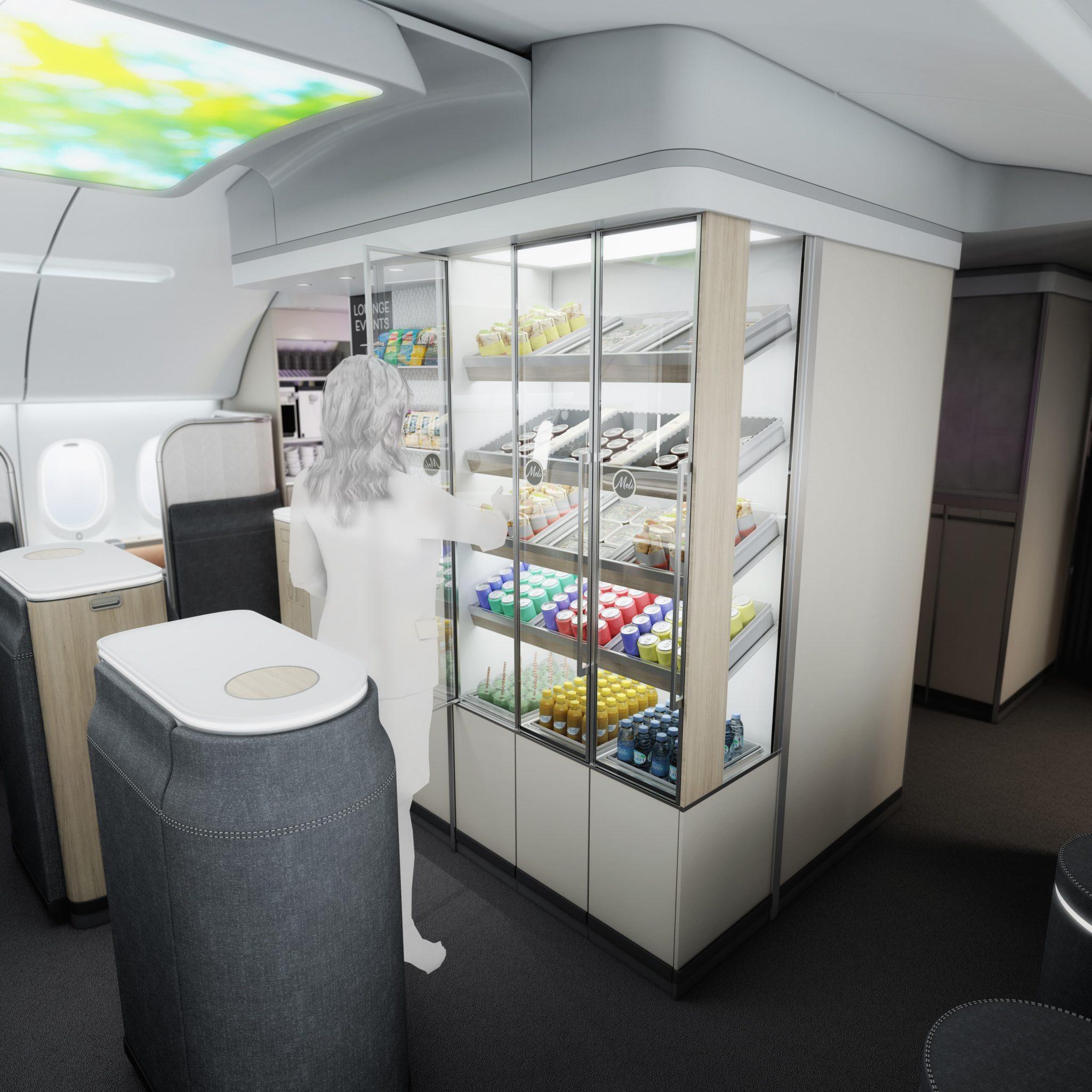 While ultra-long-haul flights have been greatly reduced during the pandemic, AIM Altitude introduced another concept for galley flexibility that was shortlisted for the 2019 Crystal Cabin Awards. The Ultraflex design features a transformable space that can be adapted throughout the flight for different passenger requirements, such as a wellness, prayer or private dining space. The concept includes a Deli Galley, which is an extended-height refrigerated food cabinet where passengers can help themselves to snacks and drinks.