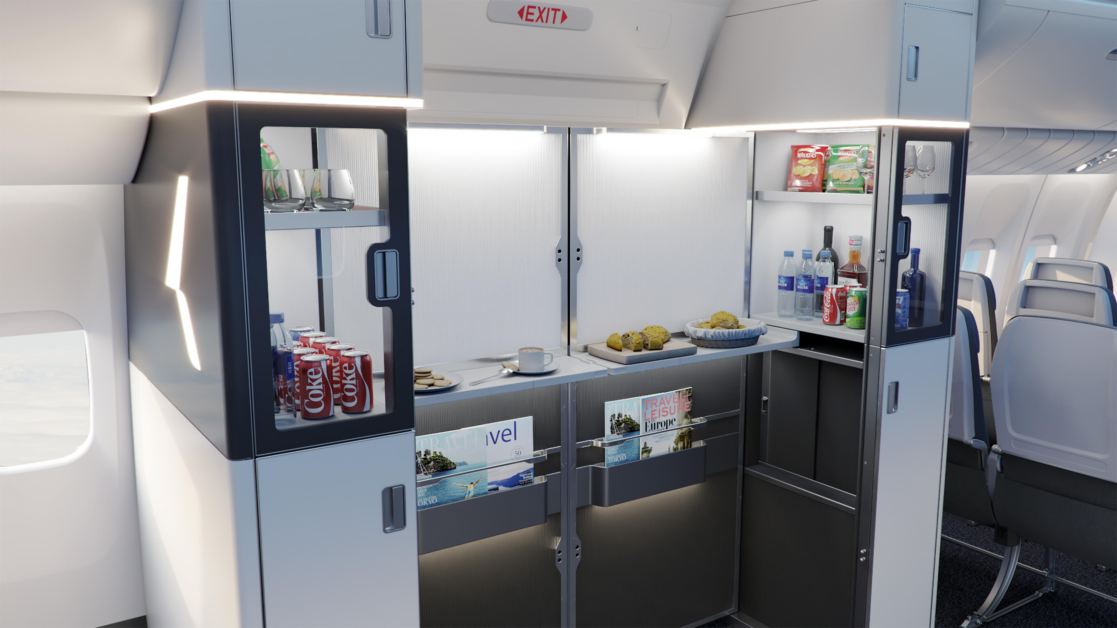 According to Imbert, Safran Cabin has concentrated efforts on maintainability of moving parts and work areas where food is being prepared. “Imagine if your dinner table was used to prep 250 meals every single day, and you can imagine how intense the wear and tear is on work surfaces,” she says. “So we are always looking at new materials and balancing the need for low weight with high durability.” In light of the pandemic, it is also working on a range of solutions to support operators in sanitization of materials and surfaces through a newly-launched partnership with 3M.