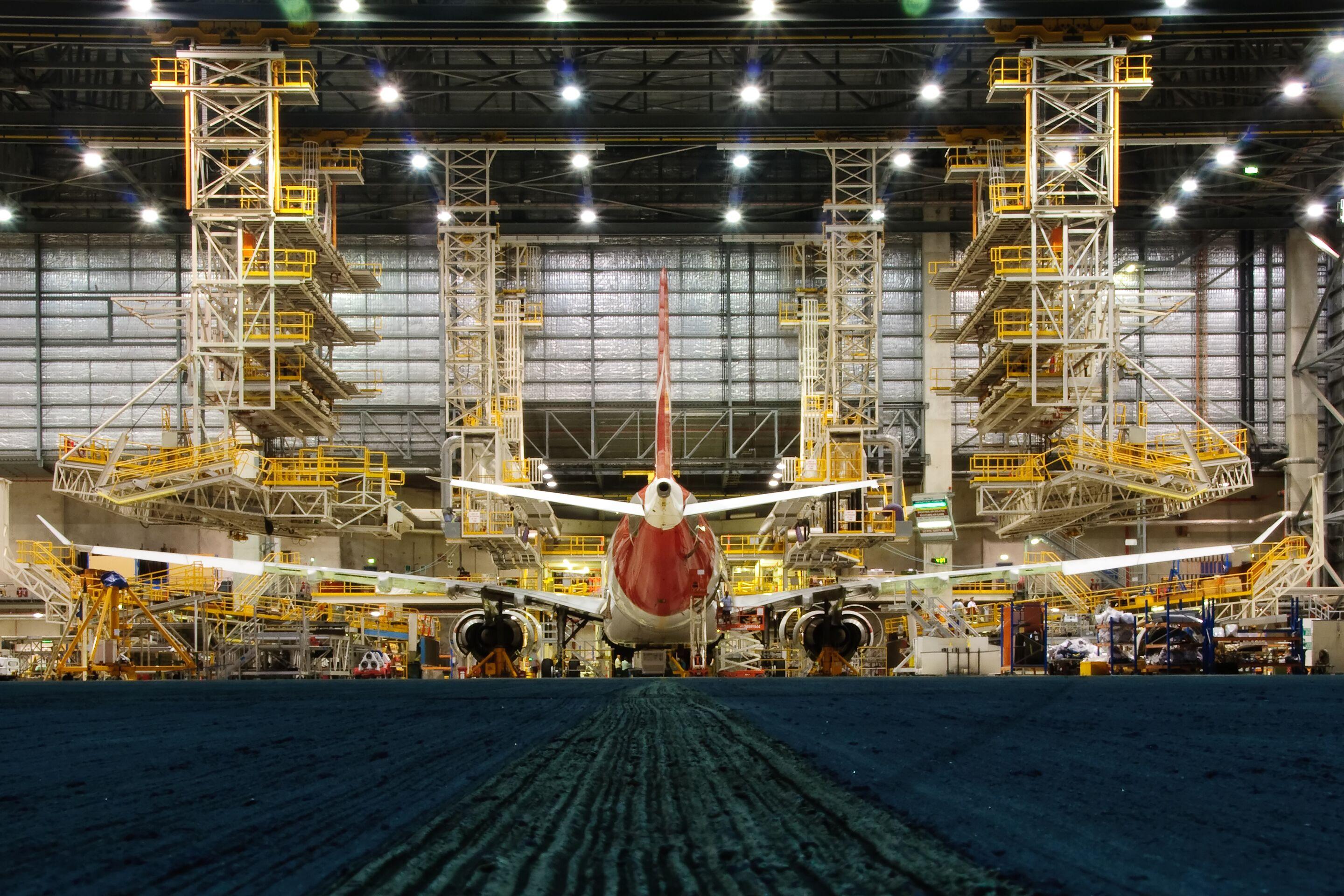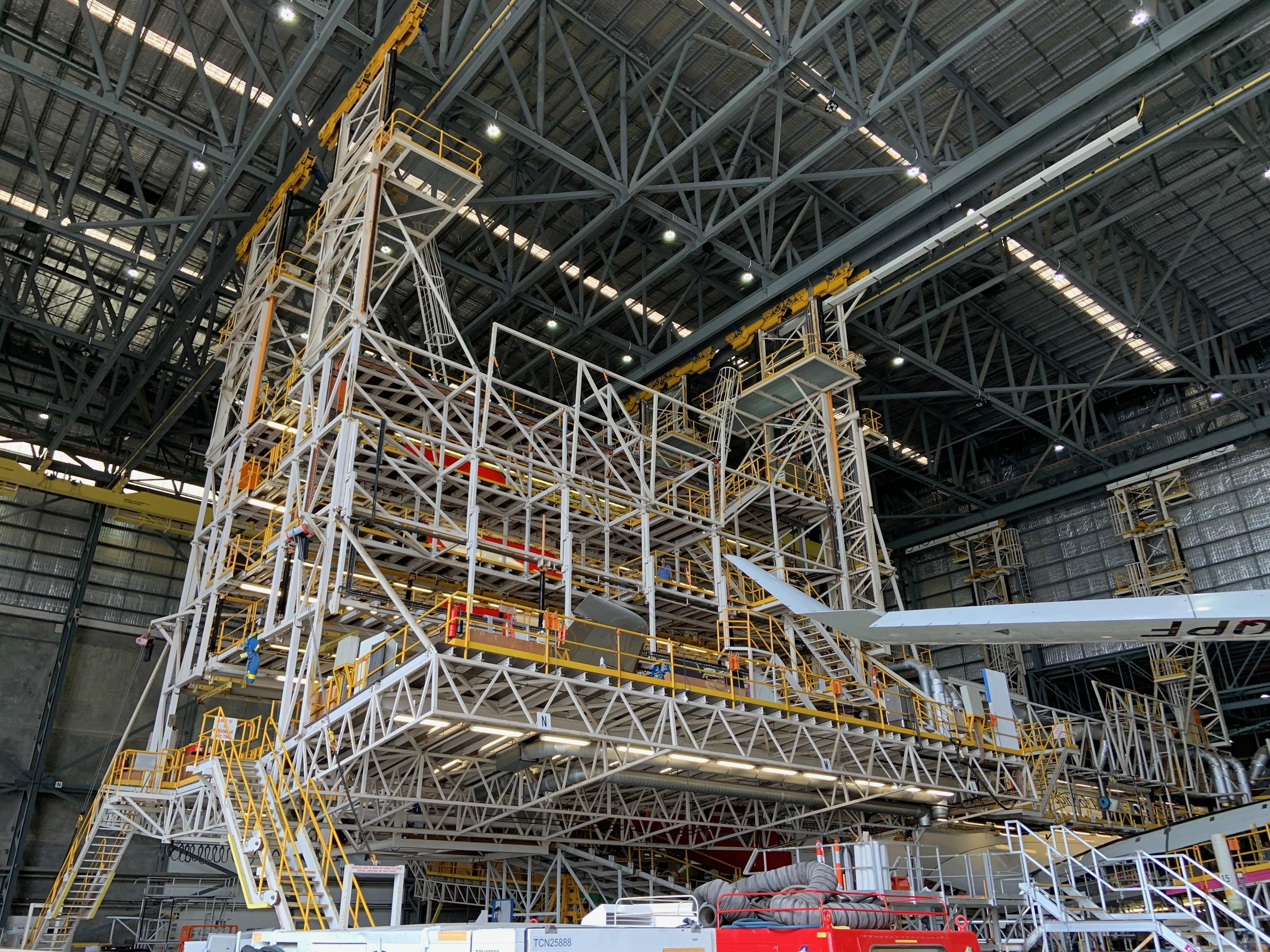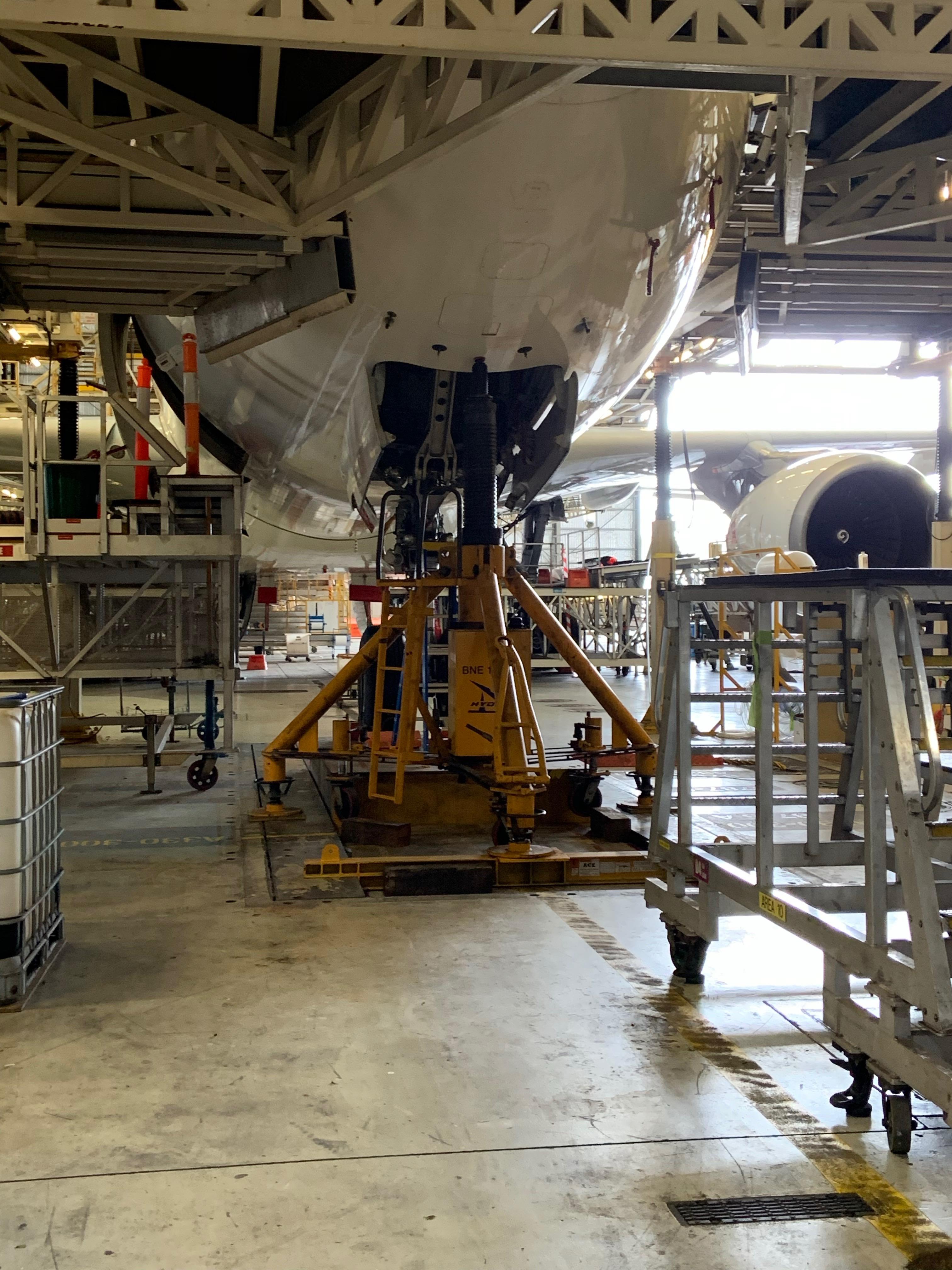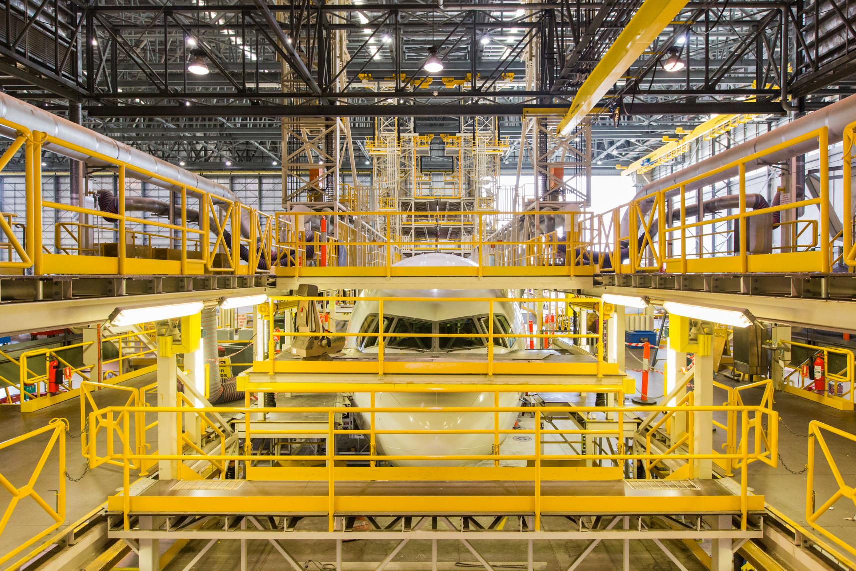 Pits in the widebody hangar move up and down to accommodate landing gear.