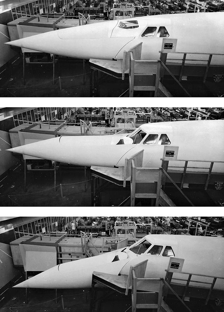 An early mockup of the Concorde original variable-geometry nose and visor is pictured in the supersonic, subsonic and approach-to-land positions. The design was changed, largely at the direction of the FAA, to include a transparent visor design challenge, since the visor also protected the main windshield panels from the effects of kinetic heating.
