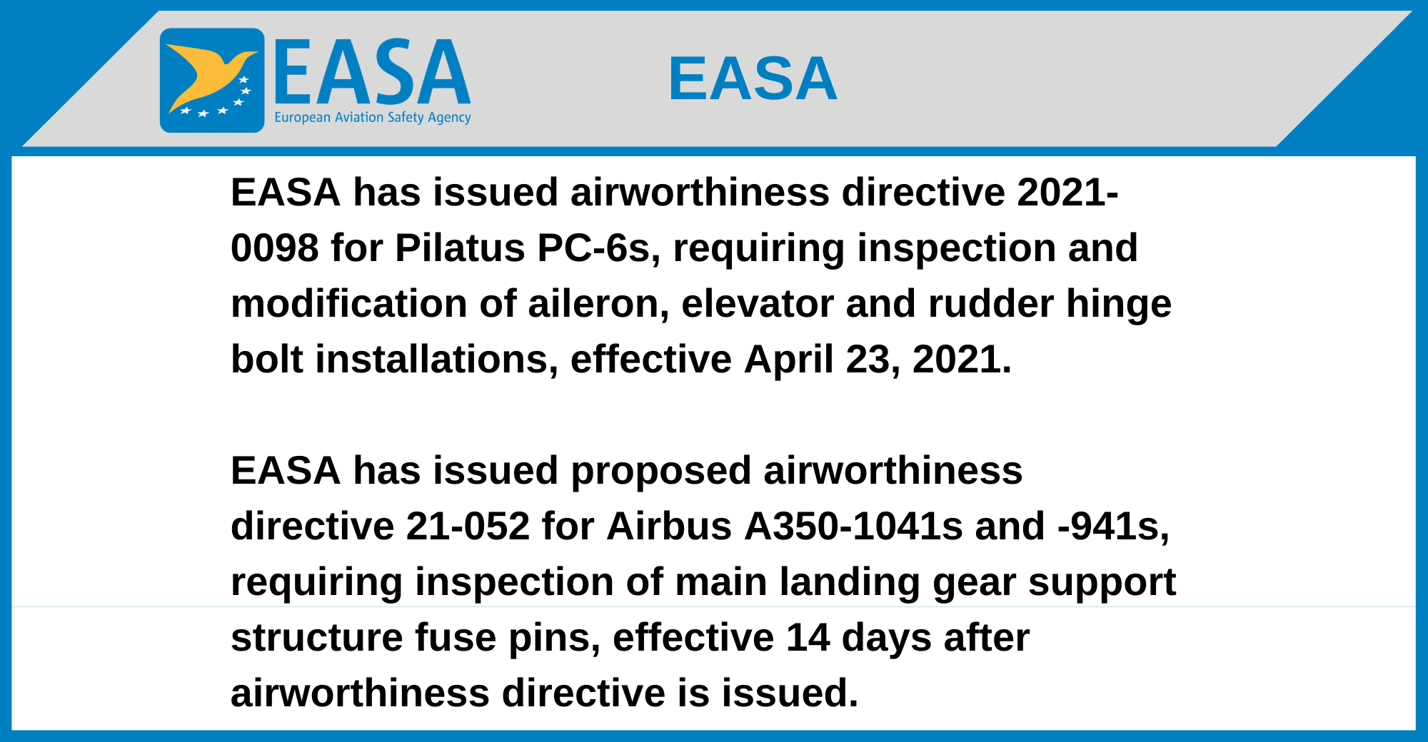 EASA has issued airworthiness directive 2021-0098 for Pilatus PC-6s, requiring inspection and modification of aileron, elevator and rudder hinge bolt installations, effective April 23, 2021.