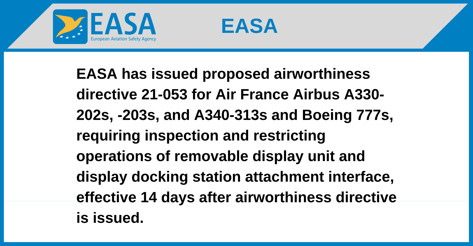 EASA has issued proposed airworthiness directive 21-053 for Air France Airbus A330-202s, -203s, and A340-313s and Boeing 777s, requiring inspection and restricting operations of removable display unit and display docking station attachment interface, effective 14 days after airworthiness directive is issued.