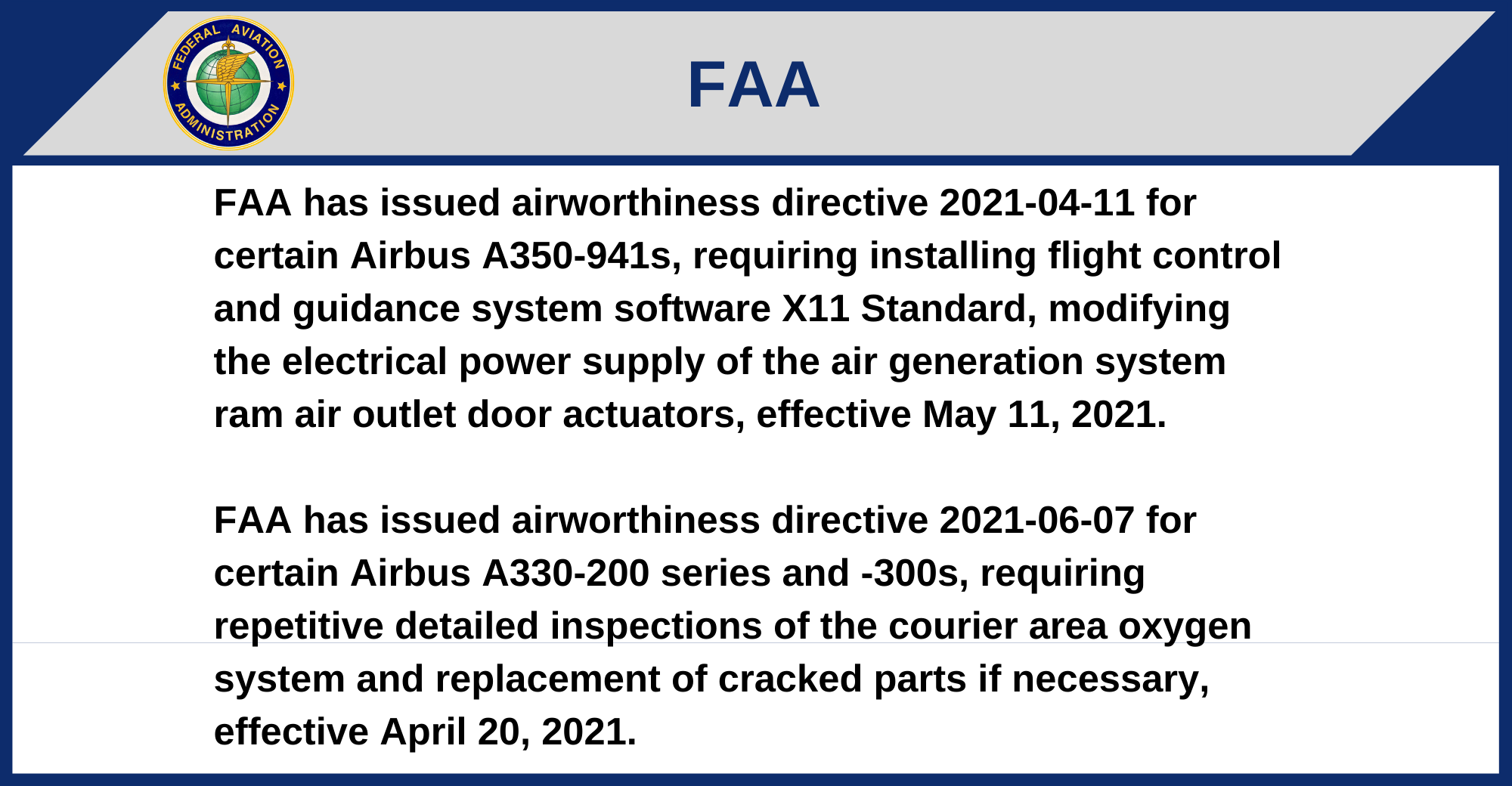 FAA has issued airworthiness directive 2021-04-11 for certain Airbus A350-941s, requiring installing flight control and guidance system software X11 Standard, modifying the electrical power supply of the air generation system ram air outlet door actuators, effective May 11, 2021.