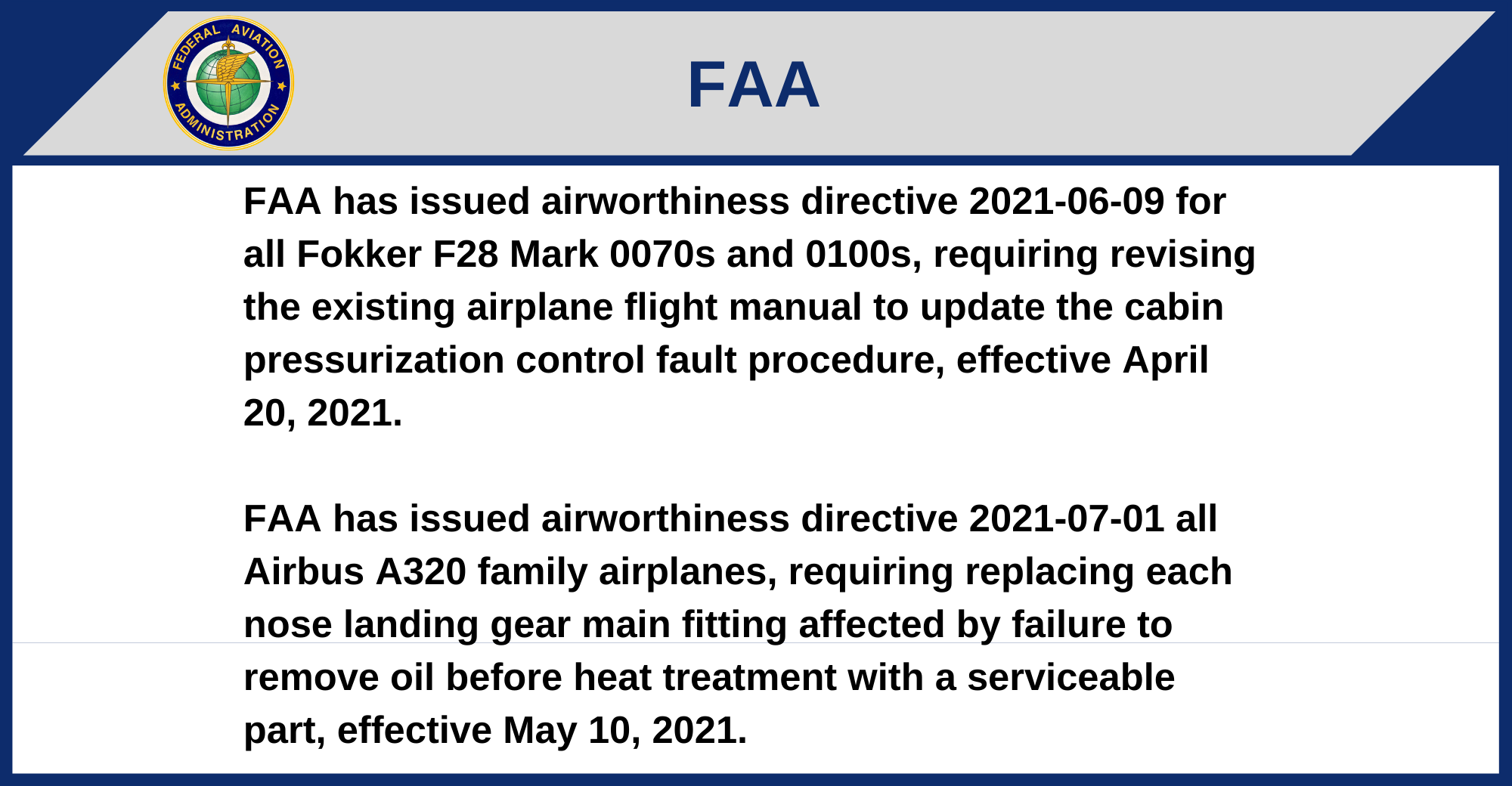 FAA has issued airworthiness directive 2021-07-01 all Airbus A320 family airplanes, requiring replacing each nose landing gear main fitting affected by failure to remove oil before heat treatment with a serviceable part, effective May 10, 2021.
