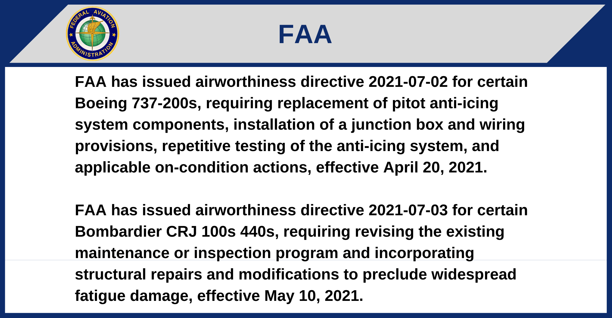 FAA has issued airworthiness directive 2021-07-03 for certain Bombardier CRJ 100s 440s, requiring revising the existing maintenance or inspection program and incorporating structural repairs and modifications to preclude widespread fatigue damage, effective May 10, 2021.