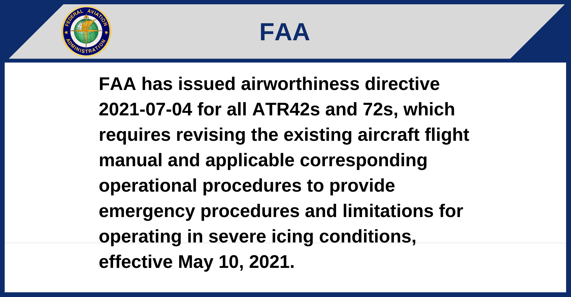 FAA has issued airworthiness directive 2021-07-04 for all ATR42s and 72s, which requires revising the existing aircraft flight manual and applicable corresponding operational procedures to provide emergency procedures and limitations for operating in severe icing conditions, effective May 10, 2021.
