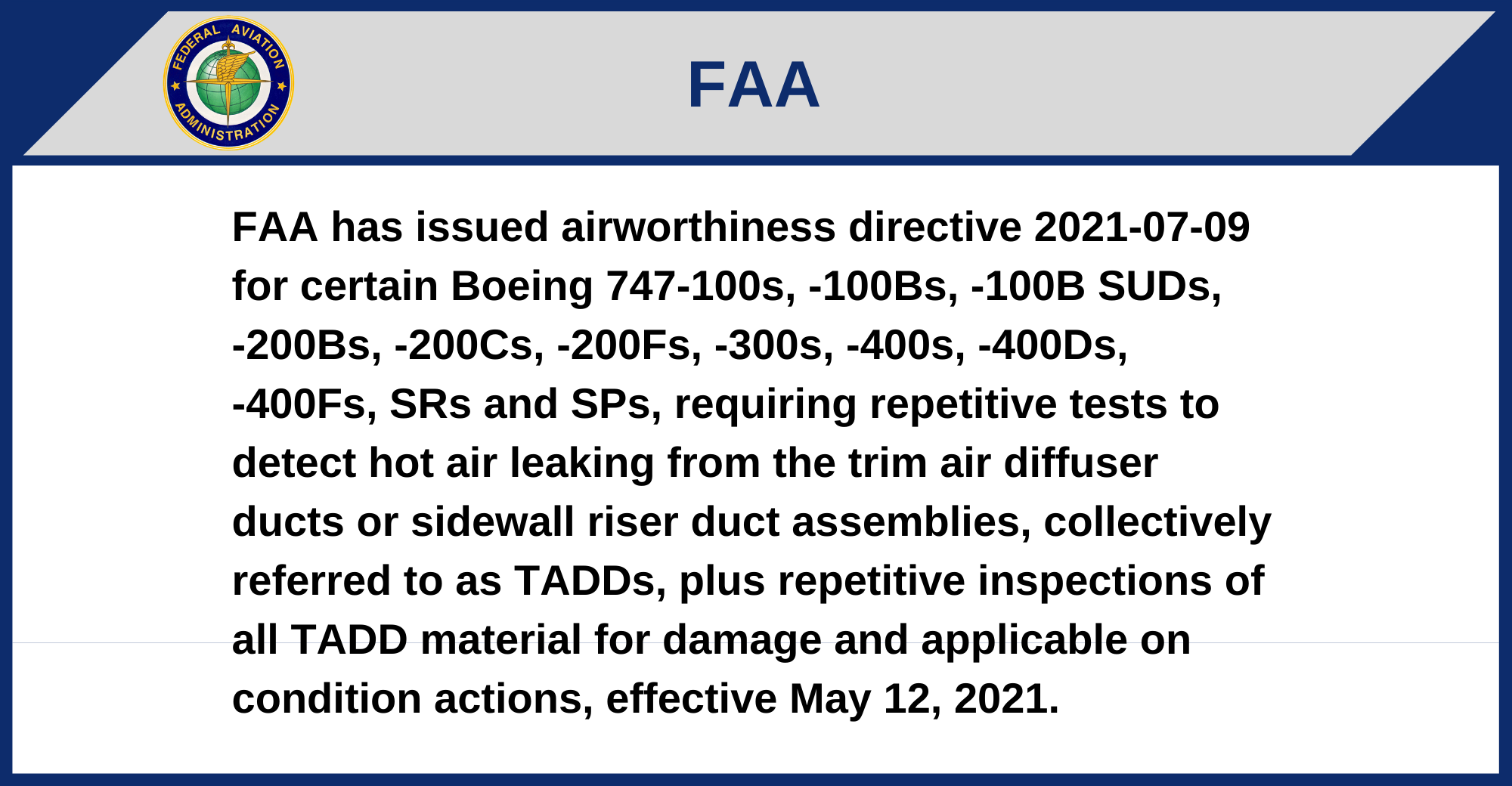 FAA has issued airworthiness directive 2021-07-09 for certain Boeing 747-100s, -100Bs, -100B SUDs, -200Bs, -200Cs, -200Fs, -300s, -400s, -400Ds, -400Fs, SRs and SPs, requiring repetitive tests to detect hot air leaking from the trim air diffuser ducts or sidewall riser duct assemblies, collectively referred to as TADDs, plus repetitive inspections of all TADD material for damage and applicable on condition actions, effective May 12, 2021.