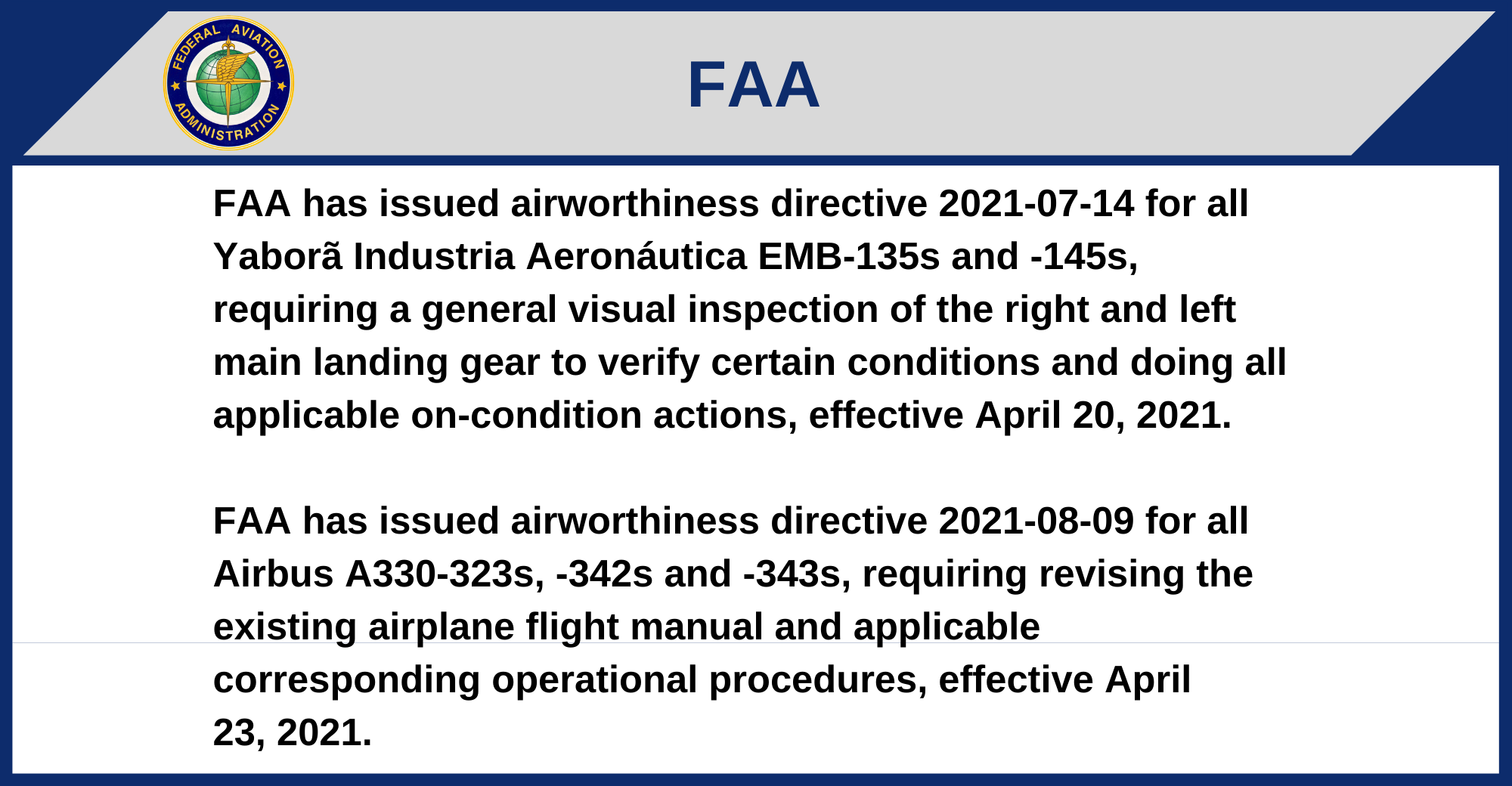 FAA has issued airworthiness directive 2021-08-09 for all Airbus A330-323s, -342s and -343s, requiring revising the existing airplane flight manual and applicable corresponding operational procedures, effective April 23, 2021.