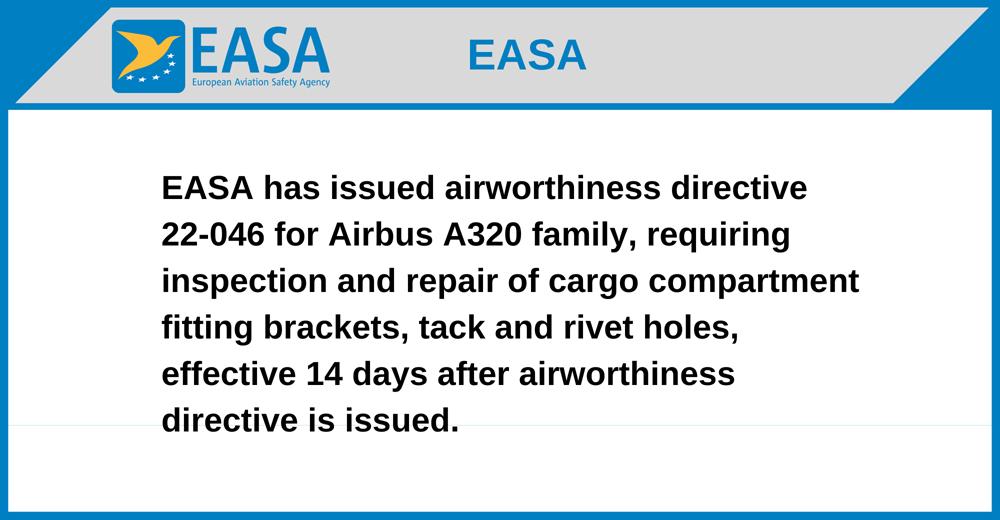 EASA has issued airworthiness directive 22-046 for Airbus A320 family, requiring inspection and repair of cargo compartment fitting brackets, tack and rivet holes, effective 14 days after airworthiness directive is issued.