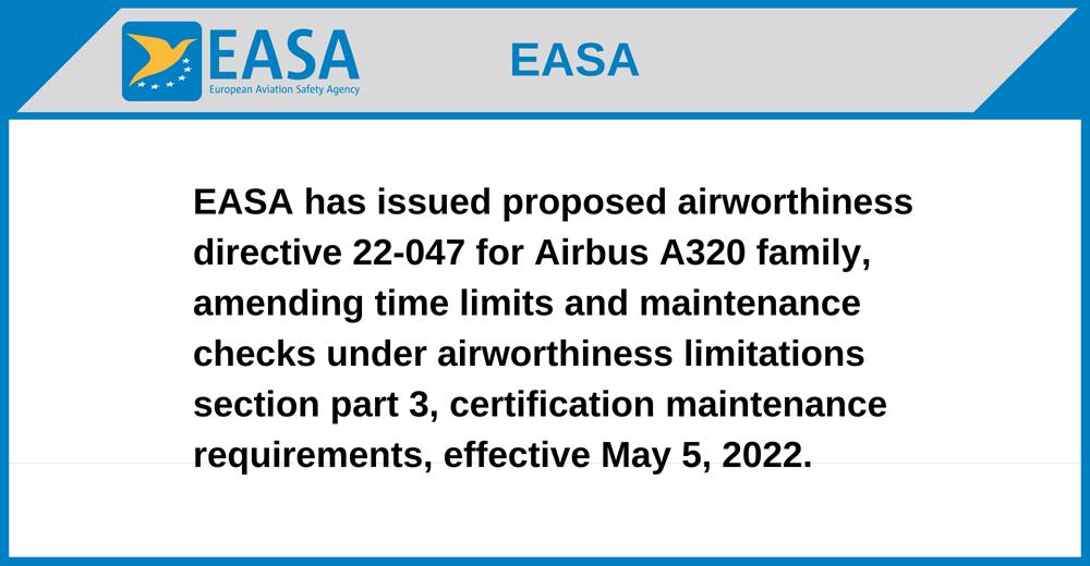 EASA has issued proposed airworthiness directive 22-047 for Airbus A320 family, amending time limits and maintenance checks under airworthiness limitations section part 3, certification maintenance requirements, effective May 5, 2022.