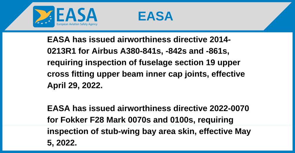 EASA has issued airworthiness directive 2022-0070 for Fokker F28 Mark 0070s and 0100s, requiring inspection of stub-wing bay area skin, effective May 5, 2022.