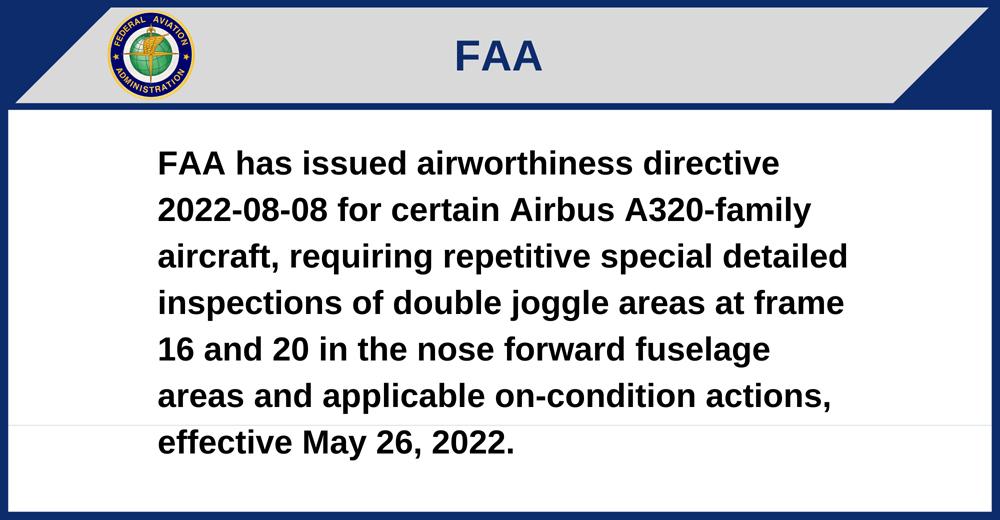 FAA has issued airworthiness directive 2022-08-08 for certain Airbus A320-family aircraft, requiring repetitive special detailed inspections of double joggle areas at frame 16 and 20 in the nose forward fuselage areas and applicable on-condition actions, effective May 26, 2022.