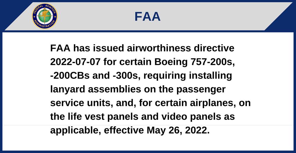 FAA has issued airworthiness directive 2022-07-07 for certain Boeing 757-200s, -200CBs and -300s, requiring installing lanyard assemblies on the passenger service units, and, for certain airplanes, on the life vest panels and video panels as applicable, effective May 26, 2022.