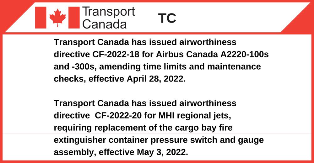 Transport Canada has issued airworthiness directive CF-2022-18 for Airbus Canada A2220-100s and -300s, amending time limits and maintenance checks, effective April 28, 2022.