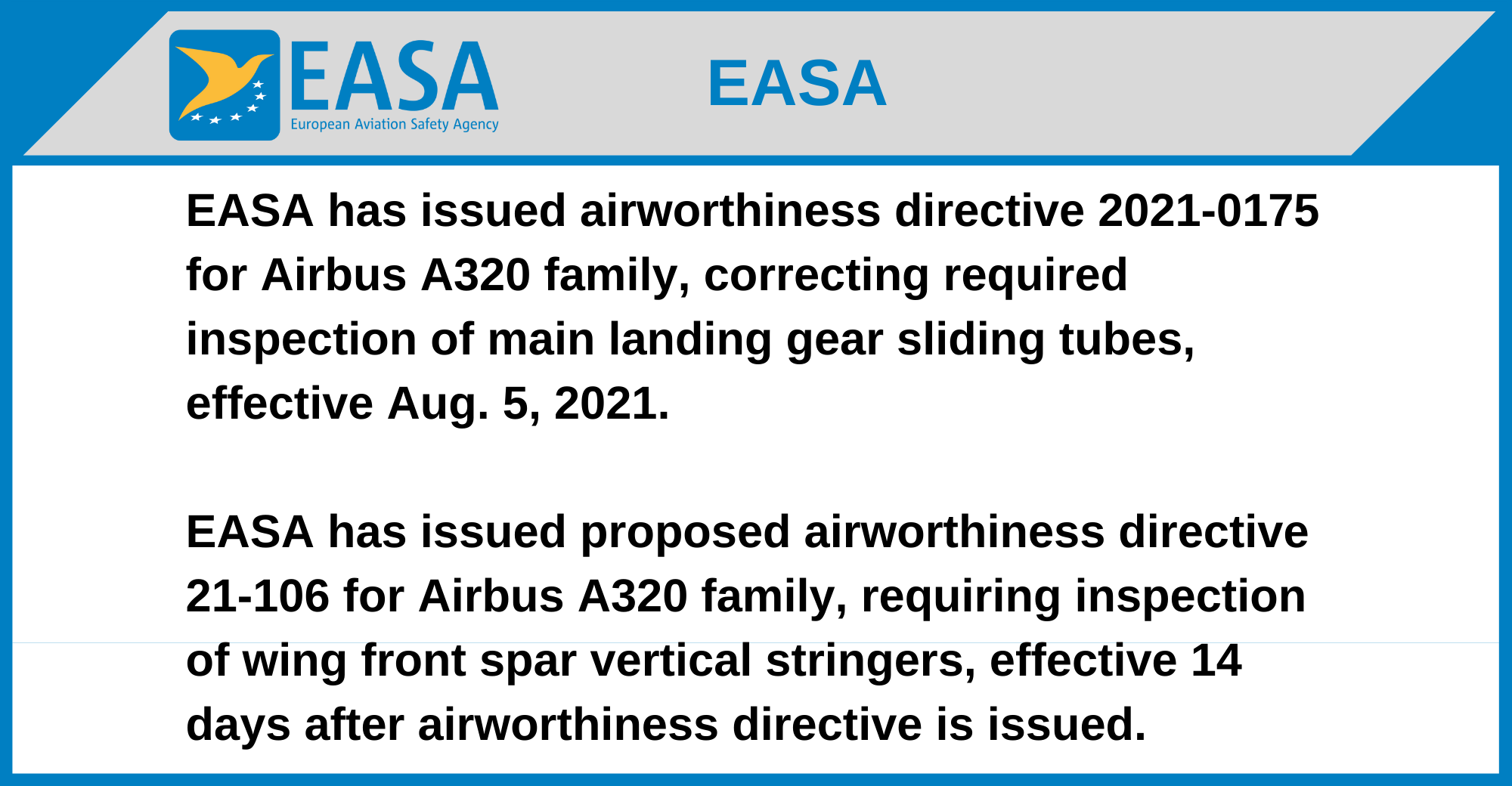 EASA has issued airworthiness directive 2021-0175 for Airbus A320 family, correcting required inspection of main landing gear sliding tubes, effective Aug. 5, 2021.