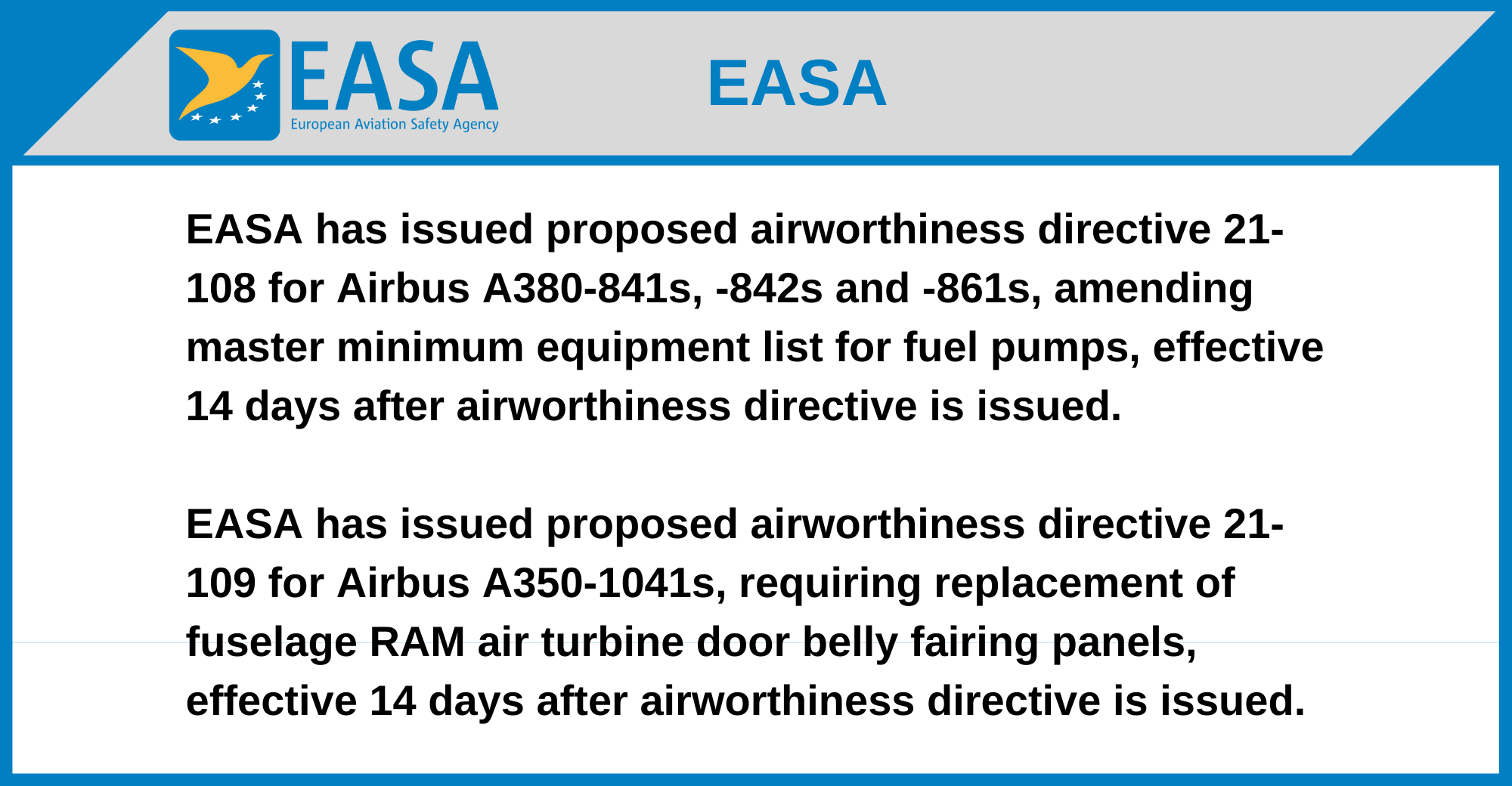 EASA has issued proposed airworthiness directive 21-108 for Airbus A380-841s, -842s and -861s, amending master minimum equipment list for fuel pumps, effective 14 days after airworthiness directive is issued.