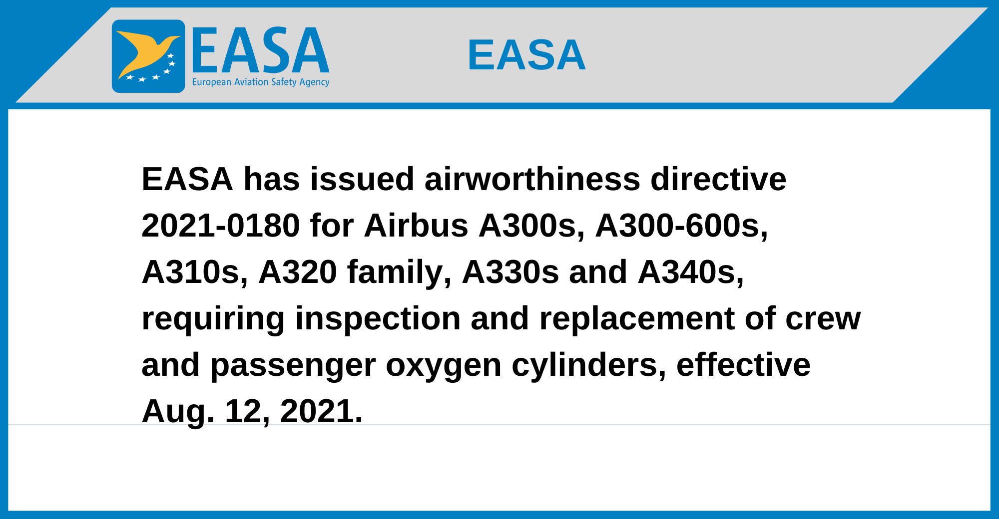 EASA has issued airworthiness directive 2021-0180 for Airbus A300s, A300-600s, A310s, A320 family, A330s and A340s, requiring inspection and replacement of crew and passenger oxygen cylinders, effective Aug. 12, 2021.