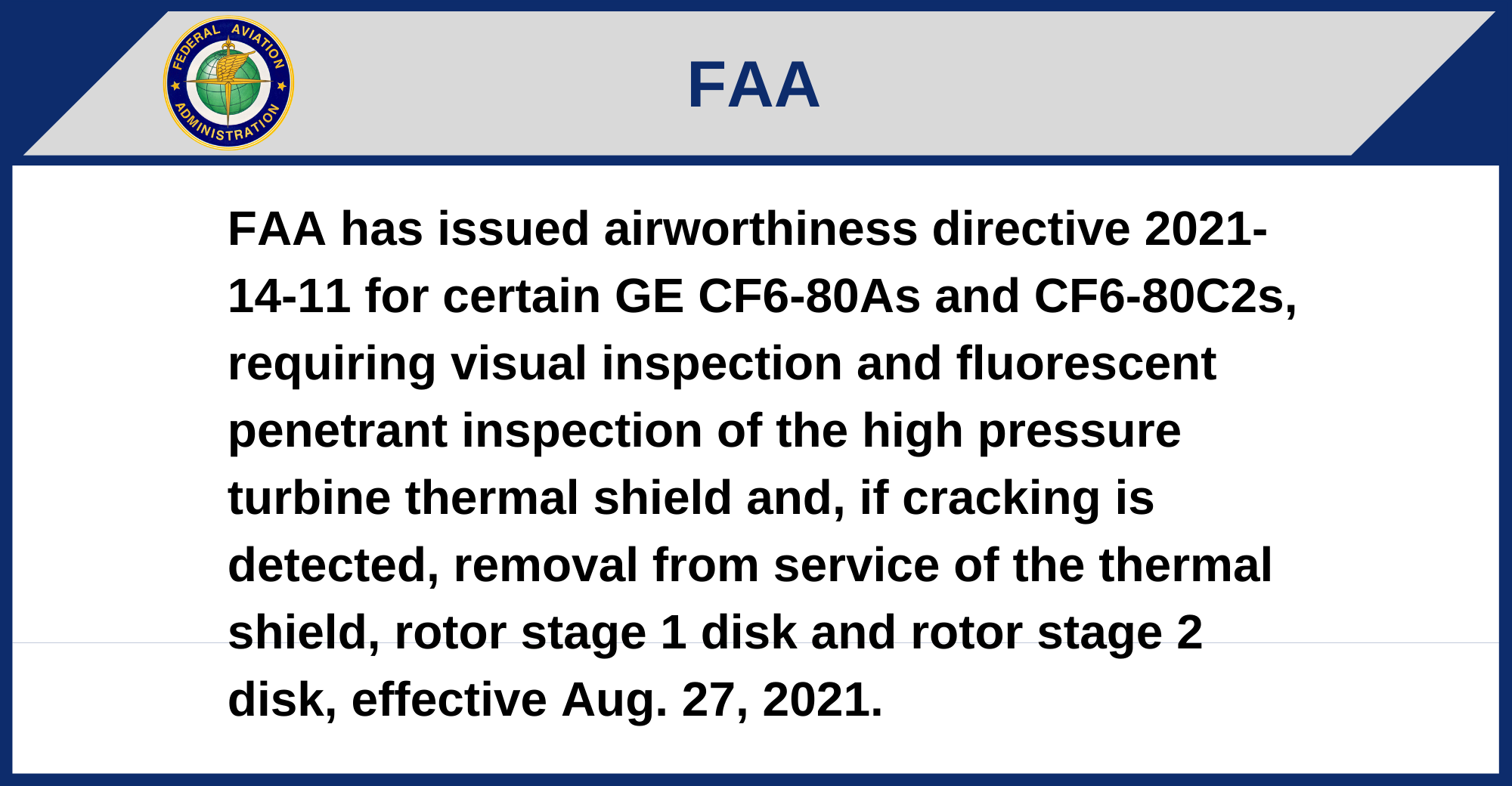 FAA has issued airworthiness directive 2021-14-11 for certain GE CF6-80As and CF6-80C2s, requiring visual inspection and fluorescent penetrant inspection of the high pressure turbine thermal shield and, if cracking is detected, removal from service of the thermal shield, rotor stage 1 disk and rotor stage 2 disk, effective Aug. 27, 2021.
