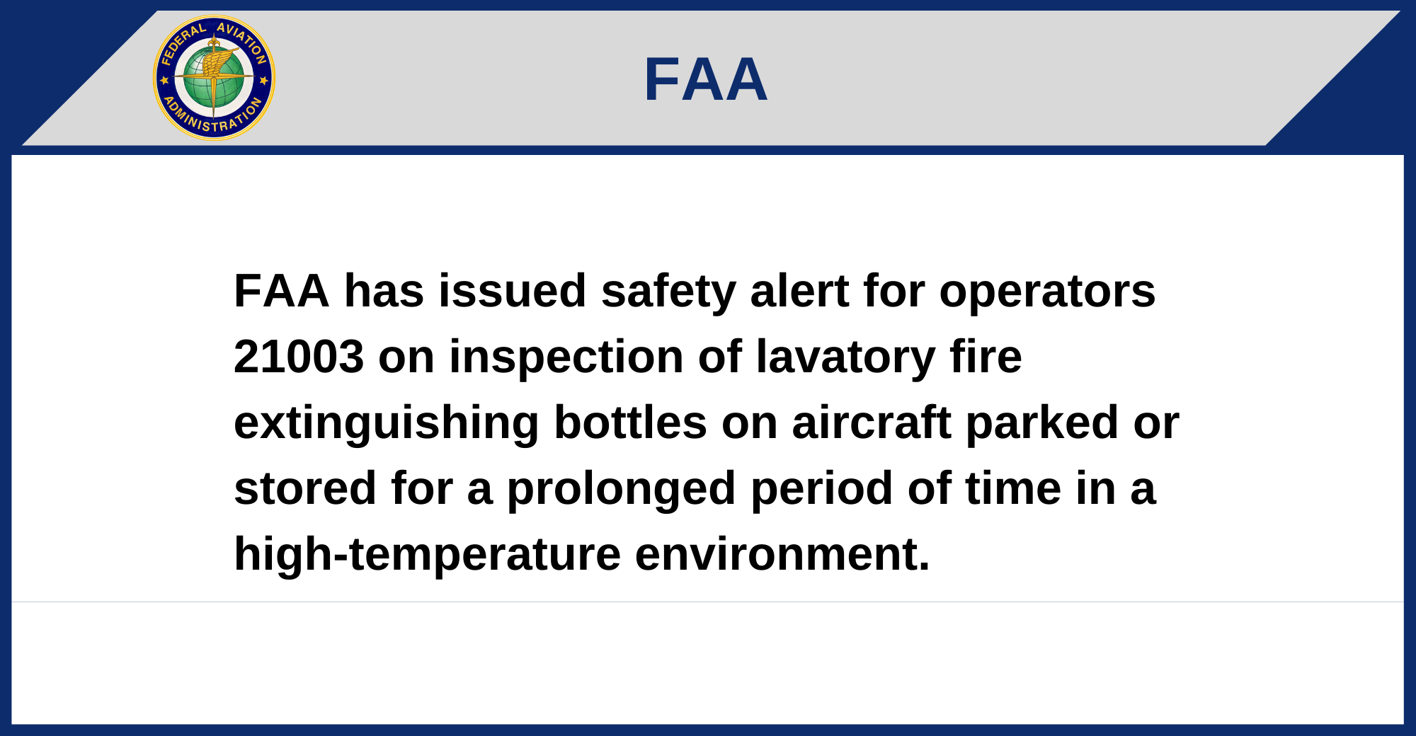 FAA has issued safety alert for operators 21003 on inspection of lavatory fire extinguishing bottles on aircraft parked or stored for a prolonged period of time in a high-temperature environment.