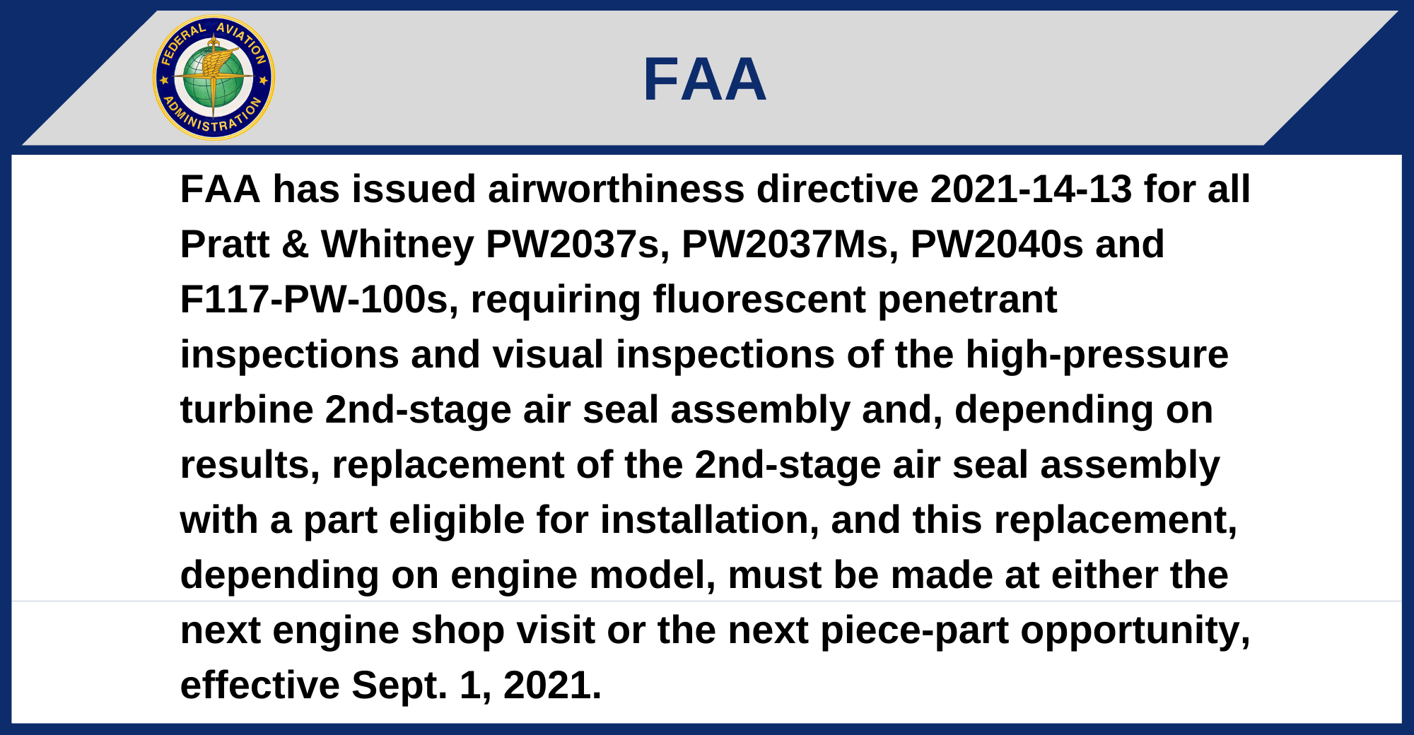 FAA has issued airworthiness directive 2021-14-13 for all Pratt & Whitney PW2037s, PW2037Ms, PW2040s and F117-PW-100s, requiring fluorescent penetrant inspections and visual inspections of the high-pressure turbine 2nd-stage air seal assembly and, depending on results, replacement of the 2nd-stage air seal assembly with a part eligible for installation, and this replacement, depending on engine model, must be made at either the next engine shop visit or the next piece-part opportunity, effective Sept. 1, 2021.