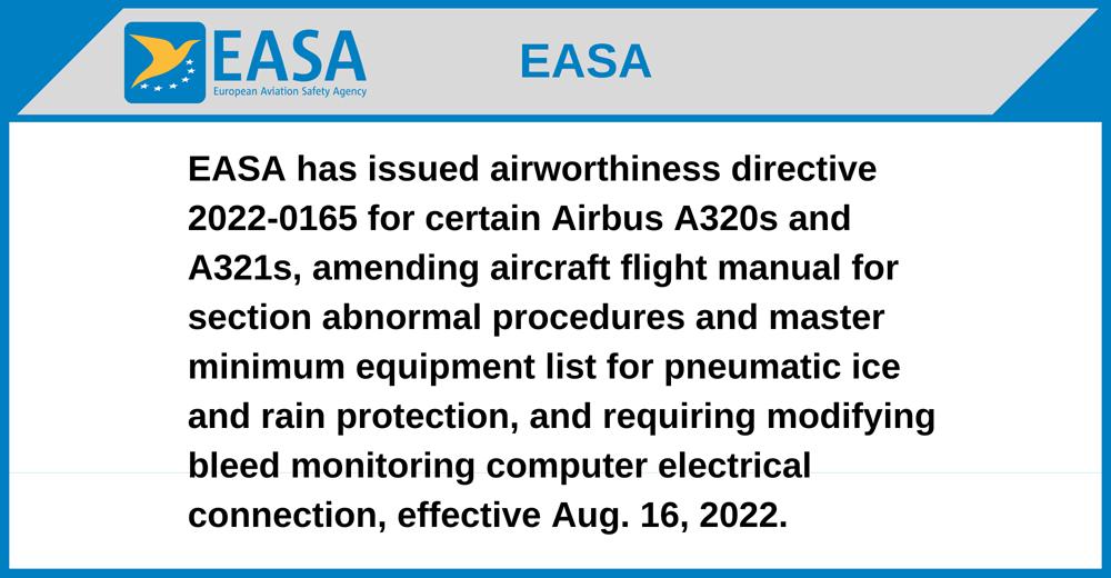 EASA has issued airworthiness directive 2022-0165 for certain Airbus A320s and A321s, amending aircraft flight manual for section abnormal procedures and master minimum equipment list for pneumatic ice and rain protection, and requiring modifying bleed monitoring computer electrical connection, effective Aug. 16, 2022.