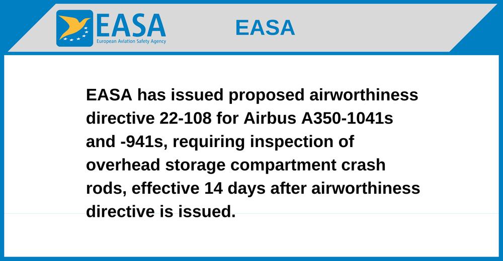 EASA has issued proposed airworthiness directive 22-108 for Airbus A350-1041s and -941s, requiring inspection of overhead storage compartment crash rods, effective 14 days after airworthiness directive is issued.