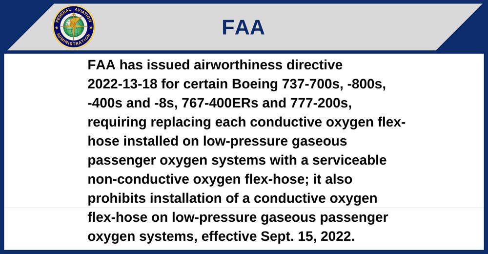 FAA has issued airworthiness directive 2022-13-18 for certain Boeing 737-700s, -800s, -400s and -8s, 767-400ERs and 777-200s, requiring replacing each conductive oxygen flex-hose installed on low-pressure gaseous passenger oxygen systems with a serviceable non-conductive oxygen flex-hose; it also prohibits installation of a conductive oxygen flex-hose on low-pressure gaseous passenger oxygen systems, effective Sept. 15, 2022.