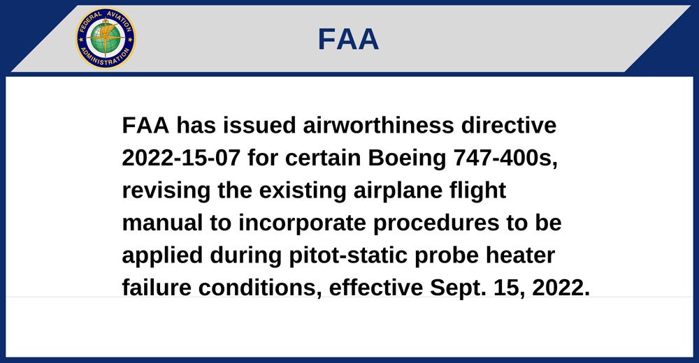 FAA has issued airworthiness directive 2022-15-07 for certain Boeing 747-400s, revising the existing airplane flight manual to incorporate procedures to be applied during pitot-static probe heater failure conditions, effective Sept. 15, 2022.