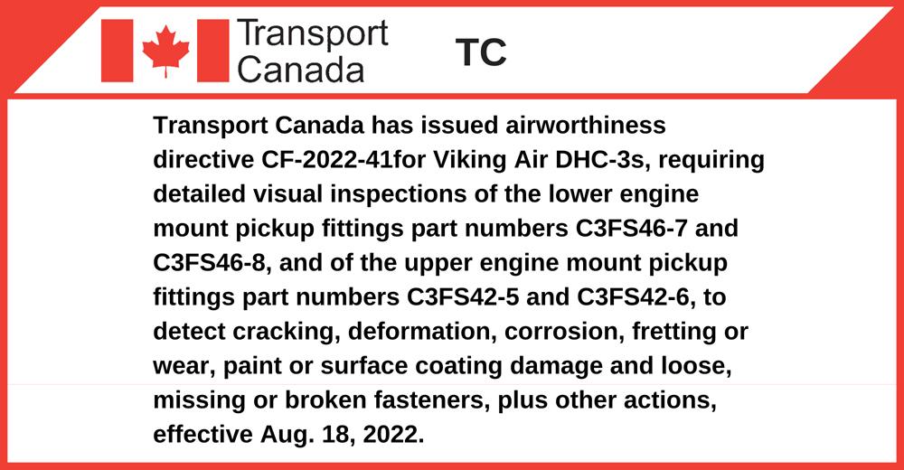 Transport Canada has issued airworthiness directive CF-2022-41 for Viking Air DHC-3s, requiring detailed visual inspections of the lower engine mount pickup fittings part numbers C3FS46-7 and C3FS46-8, and of the upper engine mount pickup fittings part numbers C3FS42-5 and C3FS42-6, to detect cracking, deformation, corrosion, fretting or wear, paint or surface coating damage and loose, missing or broken fasteners, plus other actions, effective Aug. 18, 2022.