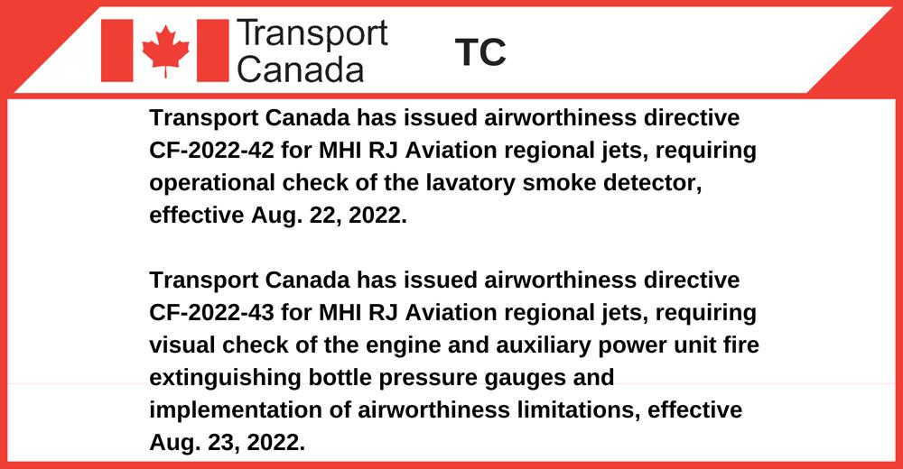 Transport Canada has issued airworthiness directive CF-2022-42 for MHI RJ Aviation regional jets, requiring operational check of the lavatory smoke detector, effective Aug. 22, 2022.