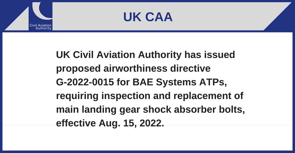 UK Civil Aviation Authority has issued proposed airworthiness directive G-2022-0015 for BAE Systems ATPs, requiring inspection and replacement of main landing gear shock absorber bolts, effective Aug. 15, 2022.