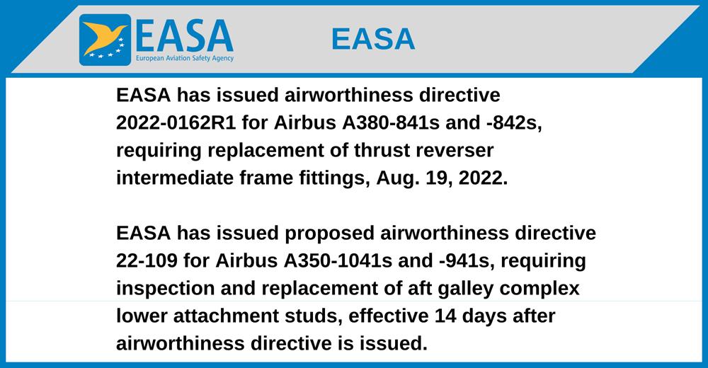 EASA has issued proposed airworthiness directive 22-109 for Airbus A350-1041s and -941s, requiring inspection and replacement of aft galley complex lower attachment studs, effective 14 days after airworthiness directive is issued.