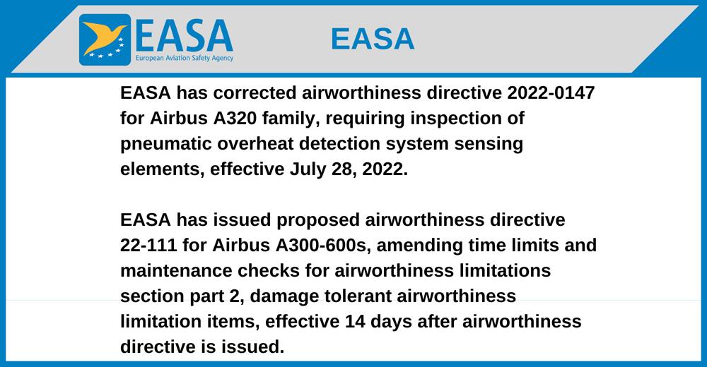EASA has corrected airworthiness directive 2022-0147 for Airbus A320 family, requiring inspection of pneumatic overheat detection system sensing elements, effective July 28, 2022.